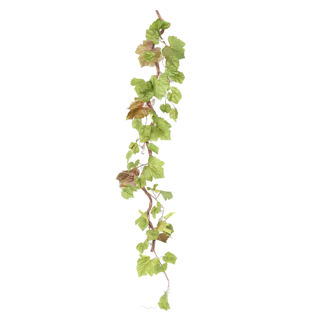 Sarment de fausse vigne avec des feuilles en tissu. La liane principale est en carton trempé serré et teinté, elle se module donc peu sans risque de casse. Les pétioles des feuilles sont armées avec des fils de fer, il est donc possible de les écartées pour les mettre dans la position voulue. Guirlande prévue pour être suspendue, ou bien attachée sur un support horizontal. Se pose également sur du mobilier par exemple. Belle imitation, différente des fausses plantes habituelles.