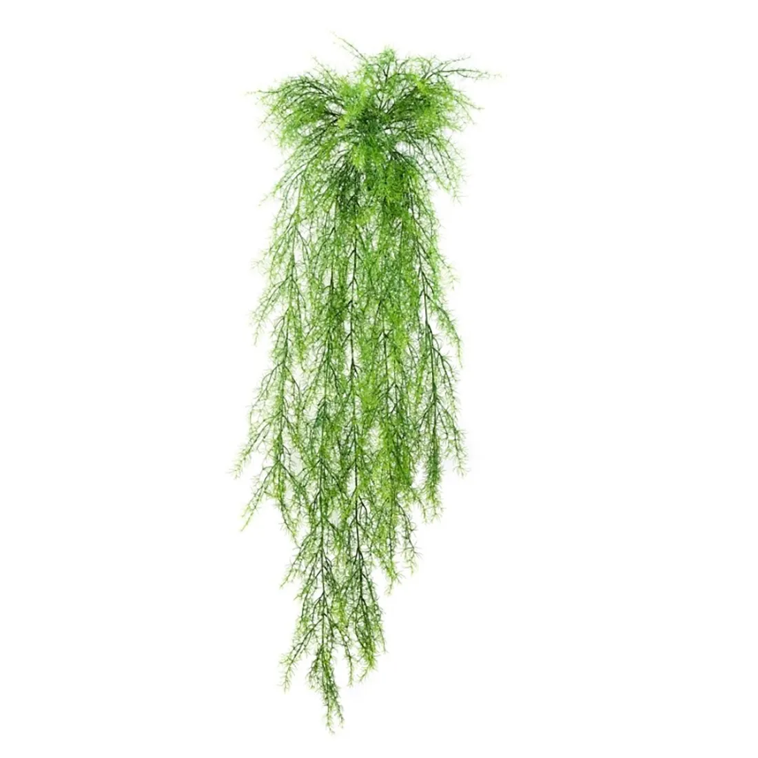 Communément appelée « fougère asperge », l’Asparagus Sprengeri n'est pas une vraie fougère mais a des feuilles qui lui ressemblent. C’est une plante grimpante de la famille des Asparagacées originaire du Sud de l’Afrique. Son feuillage artificiel singulier et délicat en plastique vert est composé de « feuilles-fil » extrêmement fines et de branches souples de différentes longueurs qui vous permettront d’adapter la forme de la plante. Cette plante herbacée synthétique ne nécessite aucun entretien (ni taille ni élagage), un simple dépoussiérage suffit amplement. Vous pouvez la placer dehors ou dans votre maison, une décoration raffinée.