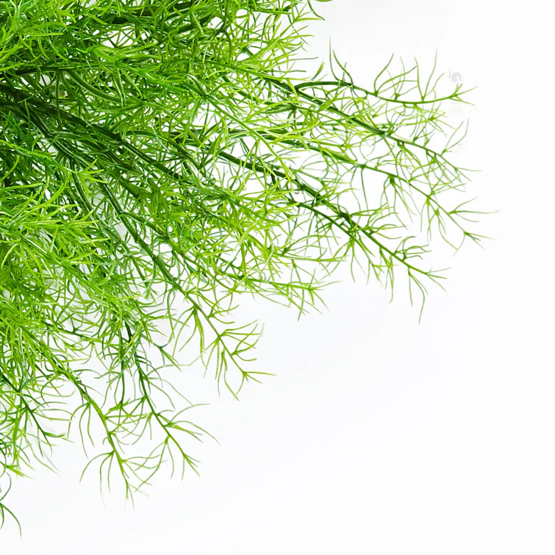 Communément appelée « fougère asperge », l’Asparagus Sprengeri n'est pas une vraie fougère mais a des feuilles qui lui ressemblent. C’est une plante grimpante de la famille des Asparagacées originaire du Sud de l’Afrique. Son feuillage artificiel singulier et délicat en plastique vert est composé de « feuilles-fil » extrêmement fines et de branches souples de différentes longueurs qui vous permettront d’adapter la forme de la plante. Cette plante herbacée synthétique ne nécessite aucun entretien (ni taille ni élagage), un simple dépoussiérage suffit amplement. Vous pouvez la placer dehors ou dans votre maison, une décoration raffinée.