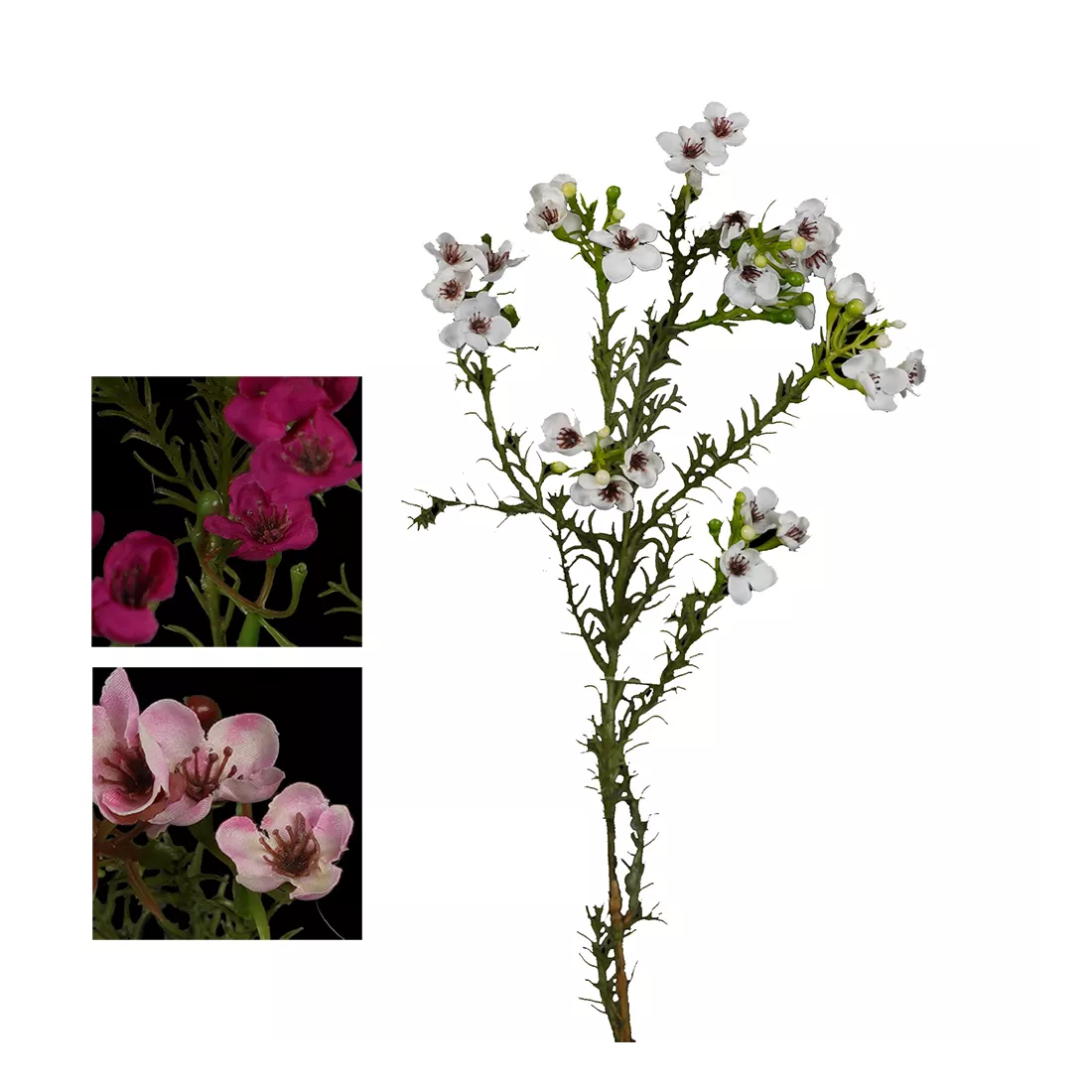 Fleur en tergal (Tissu),Feuillage tissu ( fleurs artificielles ) branche fleurie de wax artificiel de 65 cm de haut pour 14 cm de large et composée de petites fleurs de 1 cm de diamètre. Proposé en trois coloris au choix, rose clair, blanc ou fuchsia. A piquer. fleur artificielle vendue sans pot