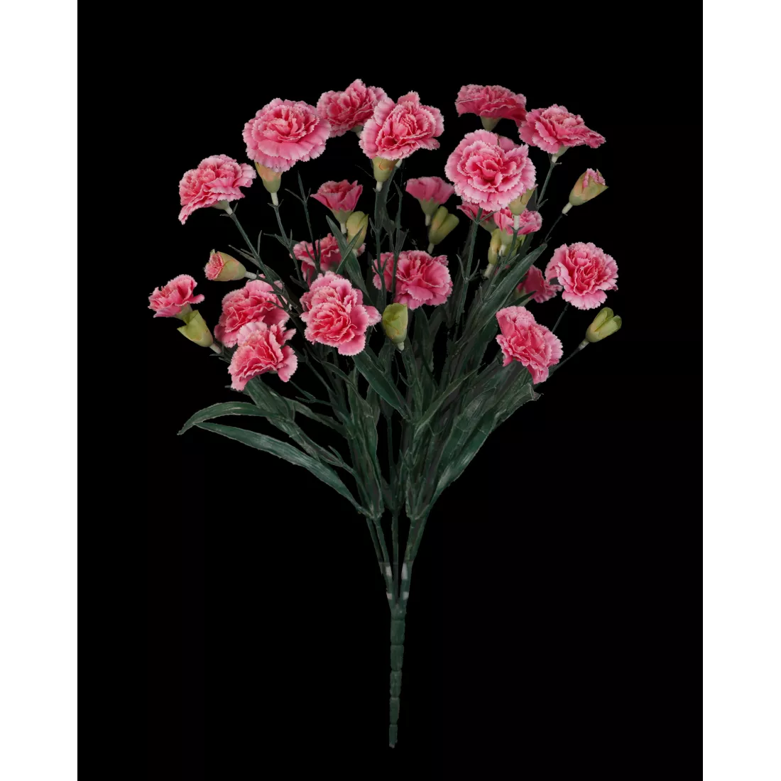 Piquet d'oeillet artificiel de 48 cm de haut pour 32 cm de large, composé d'un feuillage vert et fleurs oeillet de 5 cm de diamètre, de fleurs ouvertes 3.5 cm de diamètre et de boutons ouverts ou fermés.