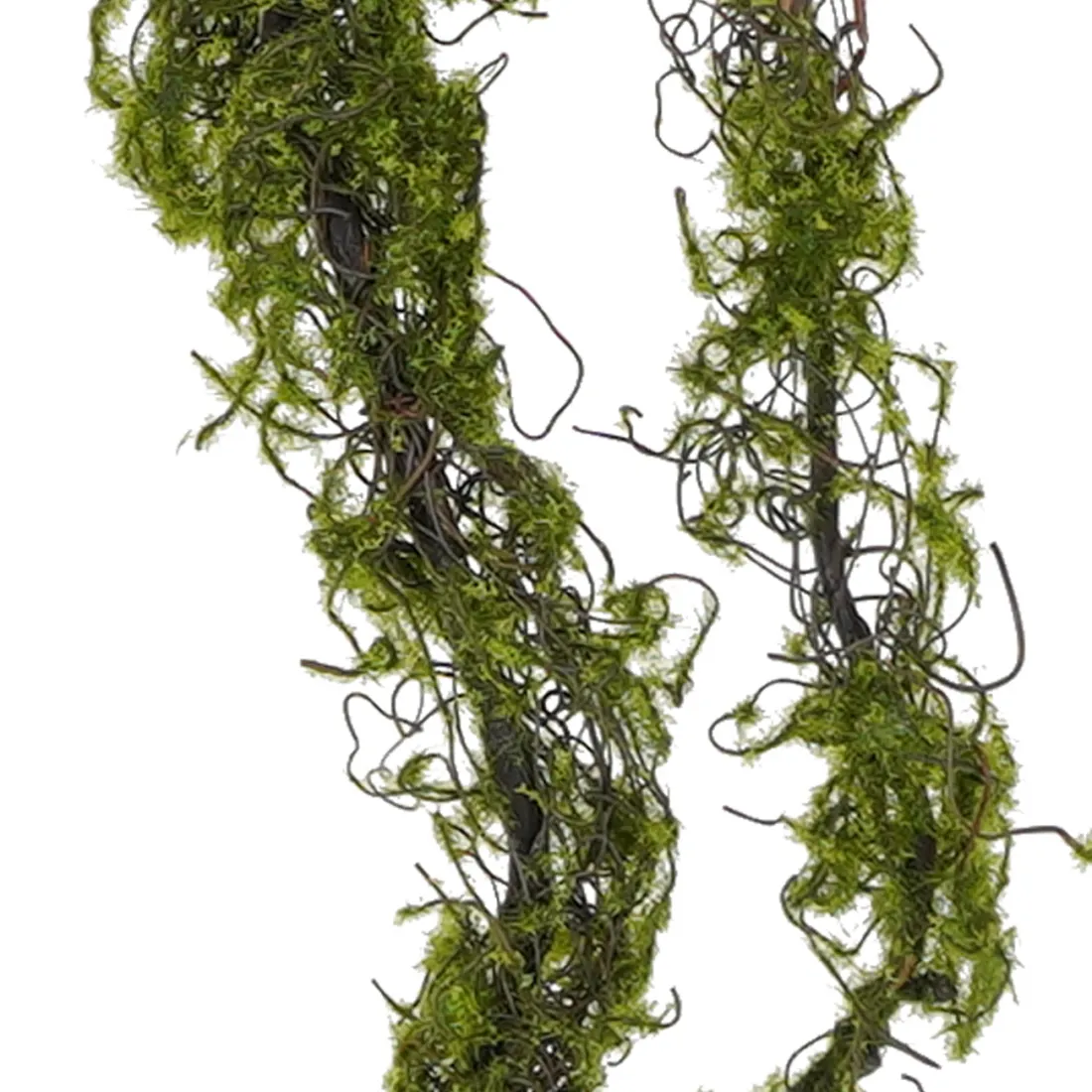 Liane de mousse artificielle en nylon et polyéthylène. Cette fausse branche mesure 85 cm de hauteur pour largeur d'environ 20 cm. Cette branche imite une branche recouverte de mousse, cette dernière n'est pas répartie de façon uniforme sur la tige, comme dans la nature.