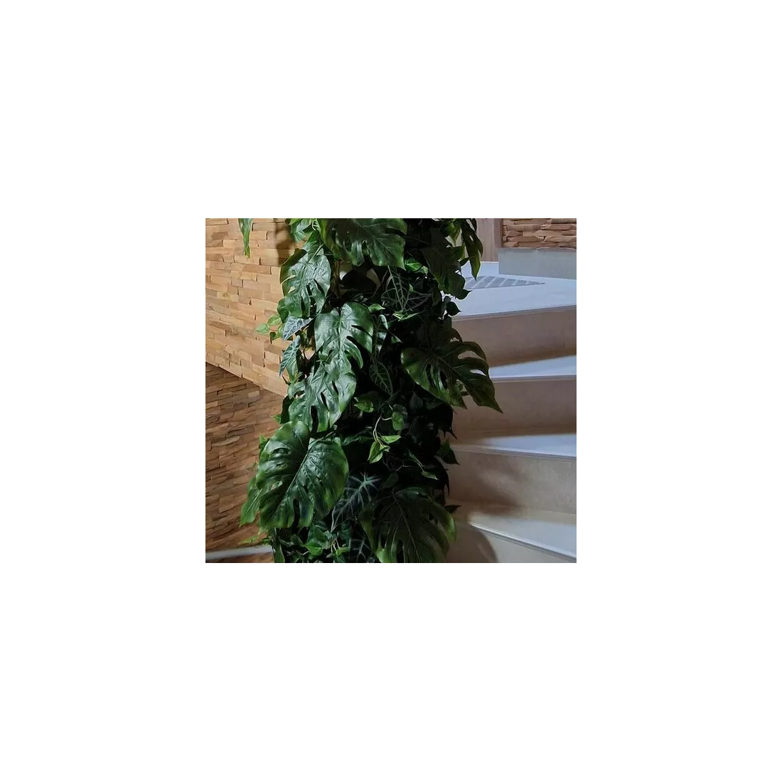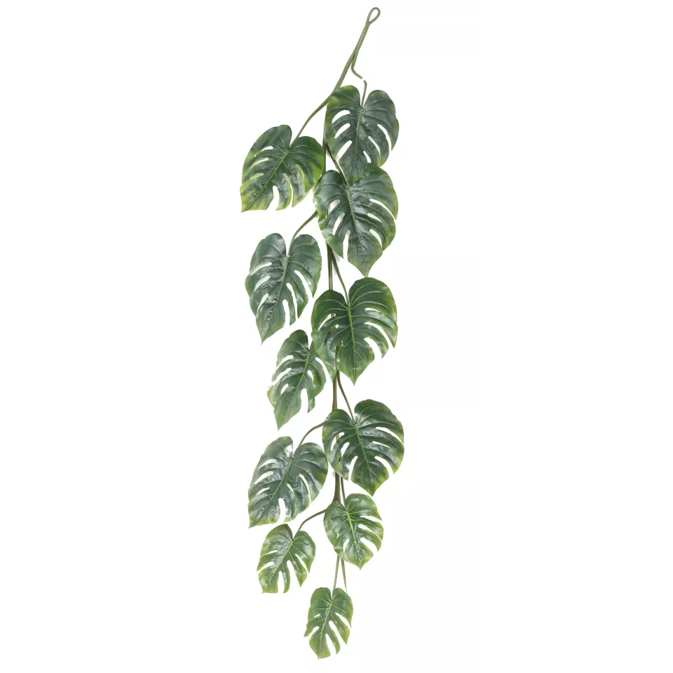 Belle guirlande de philodendron Monstera à grandes feuilles. Ce style de plante artificielle tropicale est très tendance dans la décoration d'intérieure, les utilistations d'évènements et les mise en scène de vitrines de magasins. est Le feuillage est bien découpé et comporte de jolis détails telles que les nervures. La liane est destinée à être suspendue verticale ou accrochée de manière horizontale. Parfaite pour installer dans un mur végétal exotique. Associer avec la guirlande de pothos géanteles feuillages de palmiers en tissu. Cette liane de philo habille véritablement un coin de pièce dénudé ou un poteau un peu trop présent, dans un salon, un bar ou un restaurant. Se mélange très bien avec le bois et le métal pour les ambiances industrielles.