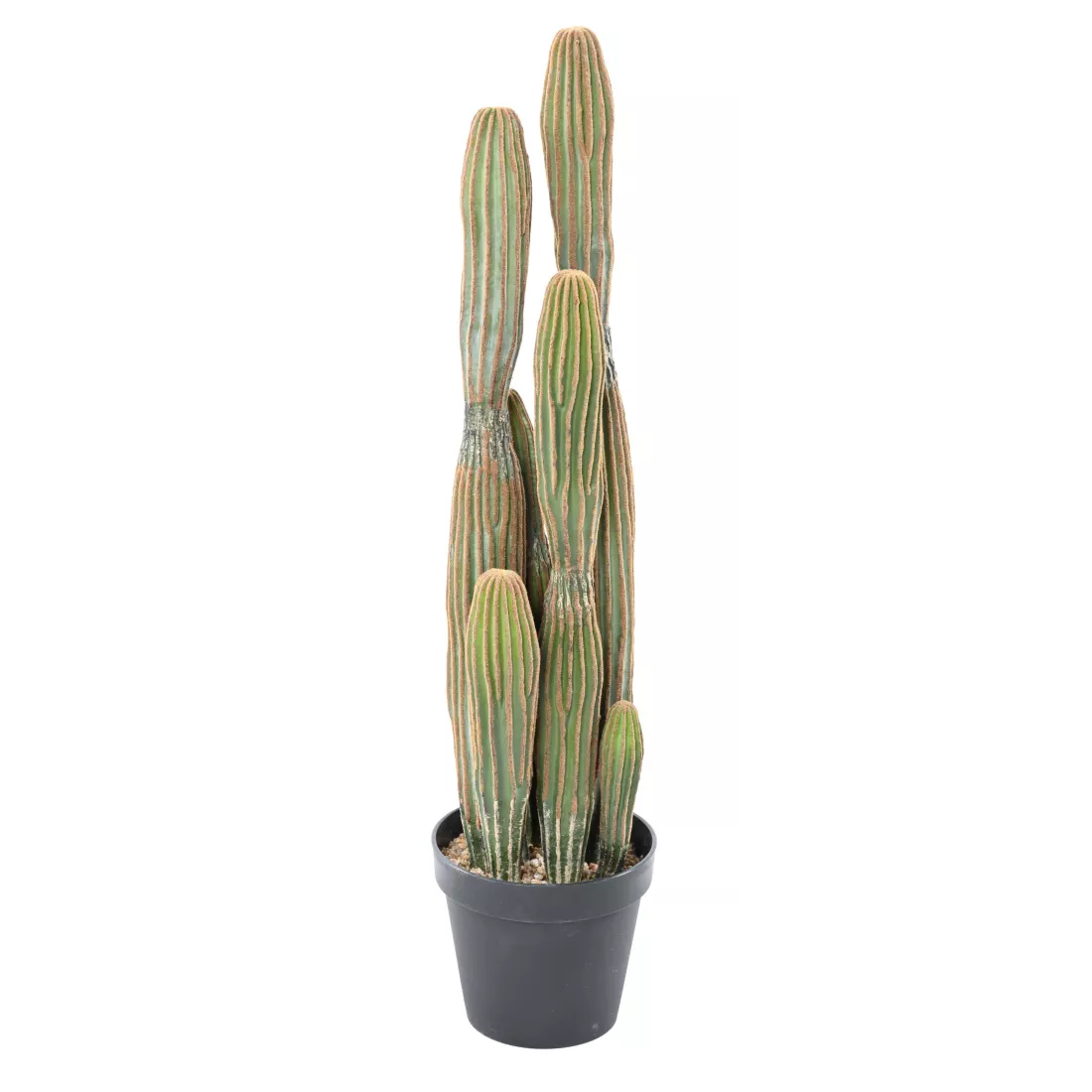 Décliné en 4 dimensions allant de 28 à 150 cm de hauteur. Livré dans un pot PVC (comme sur la photo) surfaçage en graviers collés, plantes artificielles. Cactus artificiel sans épine