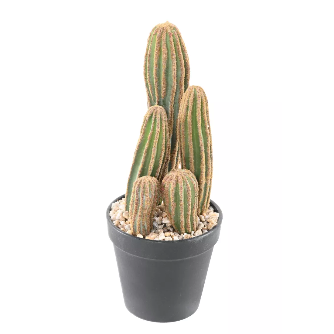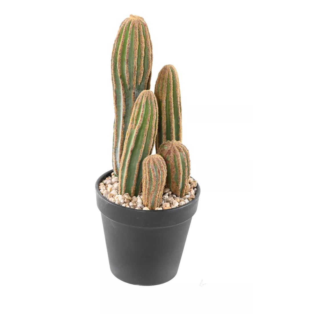 Décliné en 4 dimensions allant de 28 à 150 cm de hauteur. Livré dans un pot PVC (comme sur la photo) surfaçage en graviers collés, plantes artificielles. Cactus artificiel sans épine