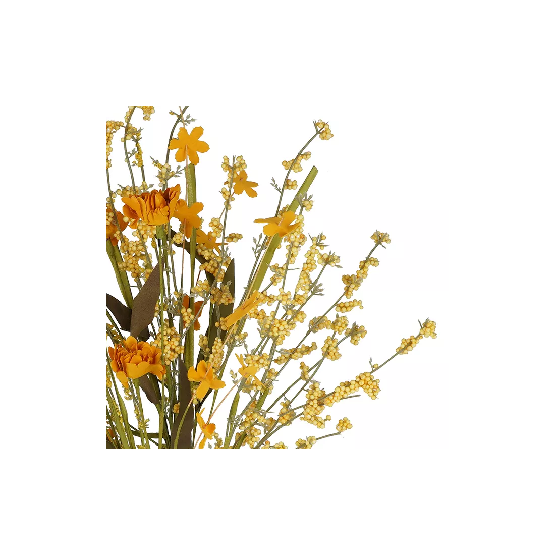 Ce bouquet est complètement dans l'air du temps avec son esprit sec. La déclinaison de jaune s'accorde parfaitement aux coloris actuels des intérieurs. Le touché est surprenant, les fleurs ont la même texture que les fleurs séchées et pour parfaire l'imitation le bruissement est quasi identique. Seul ou en nombre, glissez le dans un vase. En mélange, il s'accorde bien avec les baies rouge, orange, mais aussi avec les petits dahlia de coloris variés.