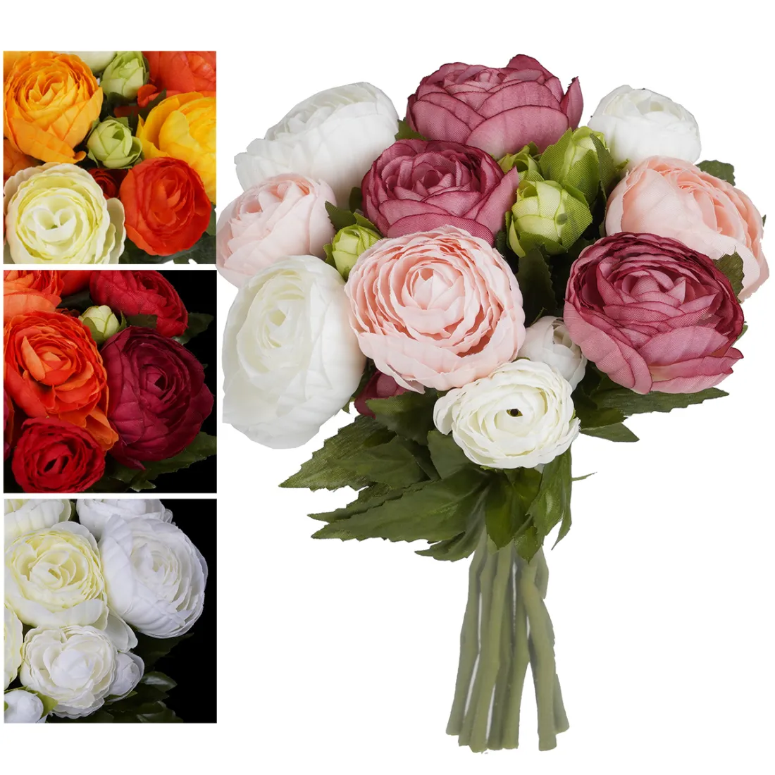 Bouquet artificiel de renoncules, composé de 10 fleurons et 8 boutons. Il mesure 22 cm de hauteur, avec une hampe florale de 10 cm et une envergure de 17 cm. Les fleurs et les feuillages sont fabriqués en tergal, un tissu de qualité. Bouquet non dissociable.