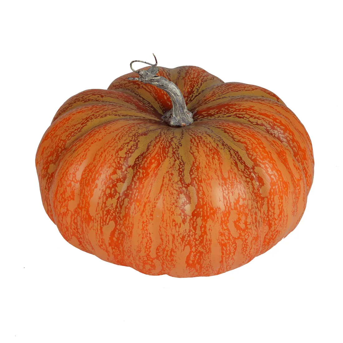 Nous vous proposons une citrouille d'aspect aplati, très ressemblante à la vraie. Le ton orangé est parsemé de tâches destinées à rendre la peau réaliste. Les curcubitacées s'hybrident très bien, aussi la nature propose bien des couleurs, nous avons un version bien imitée ici. Une belle copie pour un curcubitacée factice haut de gamme. En décoration, il est tout a fait possible de mélanger toutes les sortes de courges, que ce soit de la plus petite à la plus volumineuse, de la plus ronde à la plus allongée ou des déclinaisons de couleurs différentes.