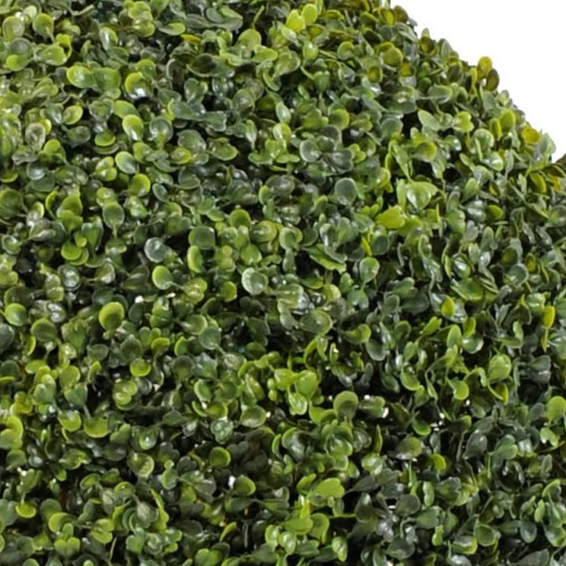 Produit haut de gamme. feuillage régulier. Deux dimensions de boule de buis diamètre 25 et 50 cm. Feuillage artificiel en polyéthylène (plastique). Buis livré dans un pot PVC (support de plantation) Le pot est accolé à la boule de buis, sur une structure plastique avec tronc bois.