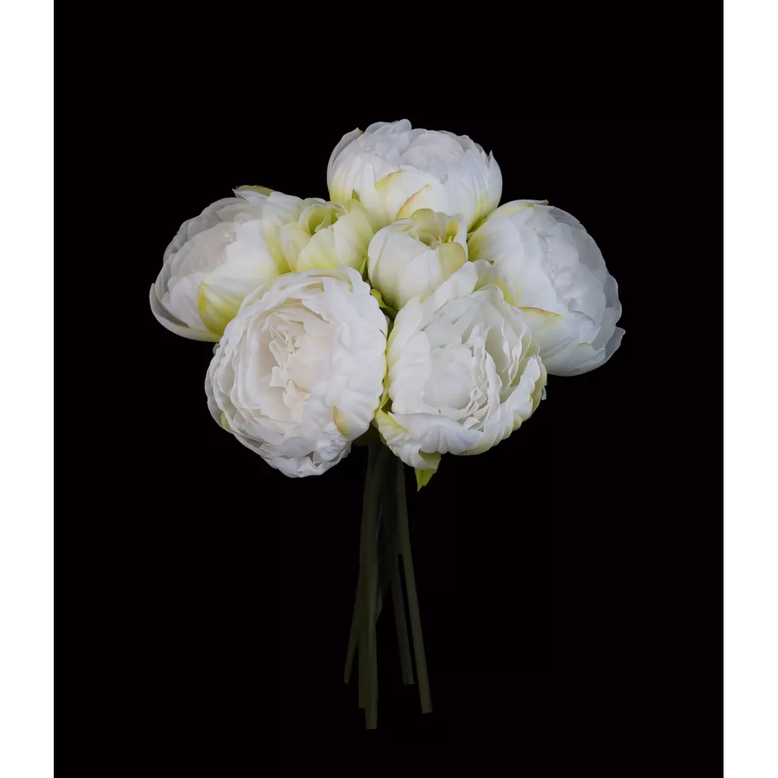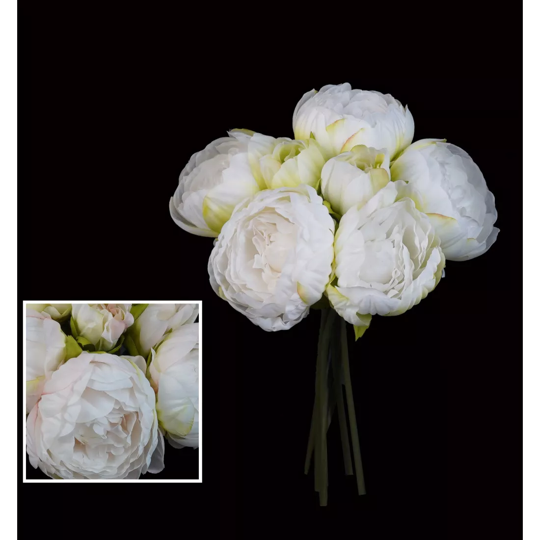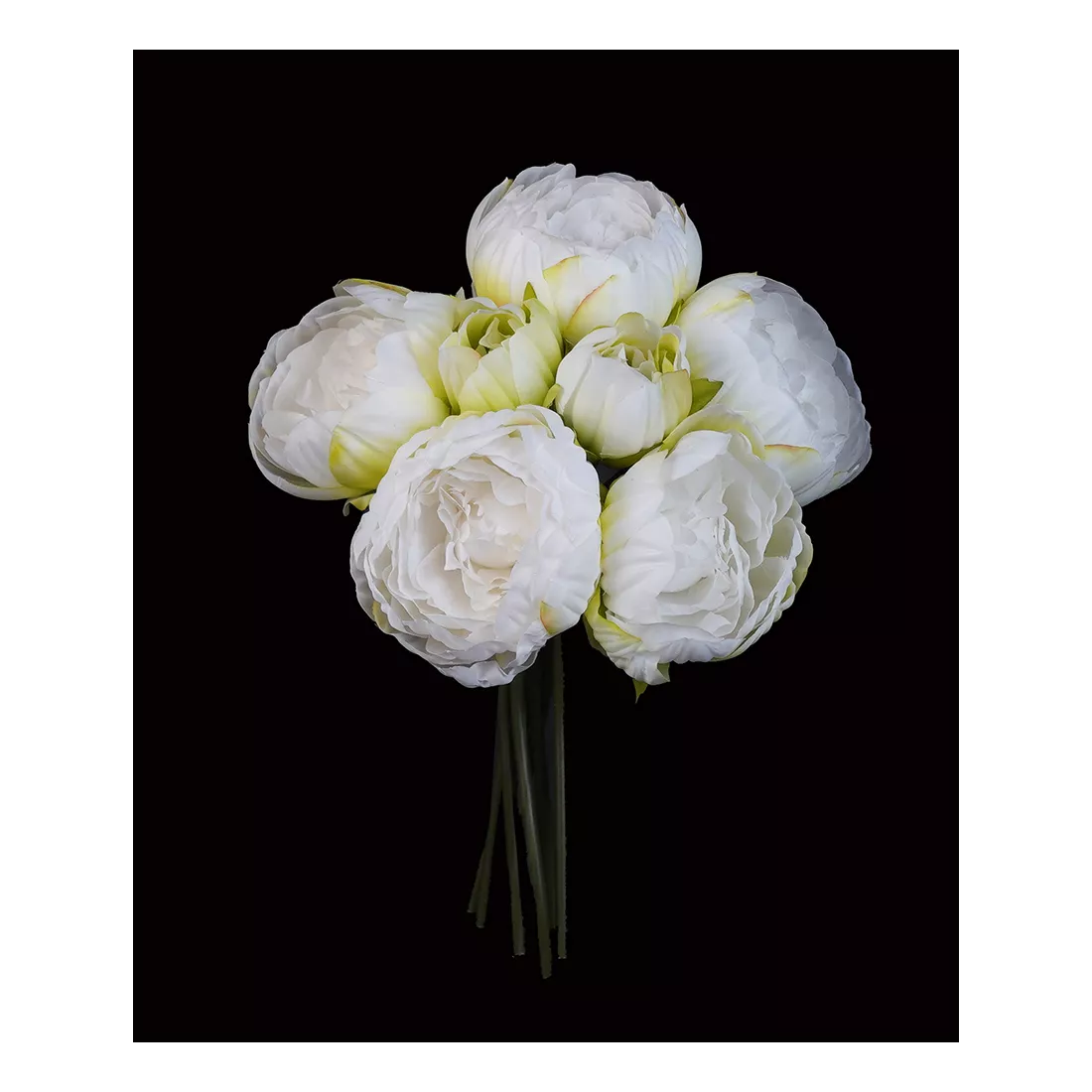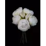 Ensemble de 5 pivoines et 2 boutons décliné en deux coloris doux et actuels, blanc et blanc rosé. Les tiges sont dissociables et il est facile de les associer avec d'autres fleurs dans les mêmes tons pastels ou plus chatoyants. Dénué de feuilles, vous pouvez rajouter des faux feuillages pour amplifier l'envergure comme l'orme ou l'acacia. Tiges courtes idéales pour les murs fleuris. Ce faux bouquet existe aussi en fushia avec des feuilles de pivoines.