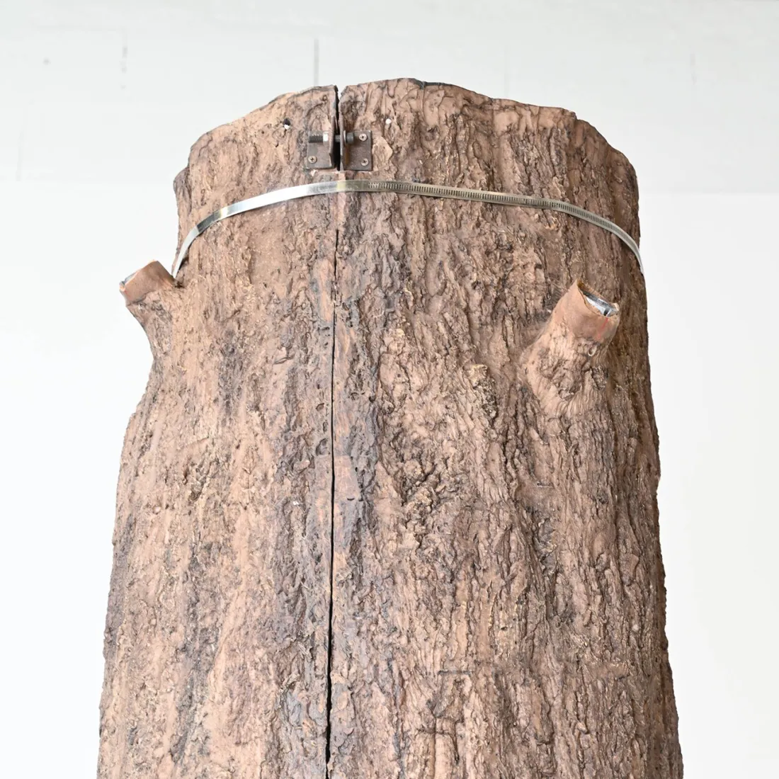 FICUS GEANT TRONC 2 PARTIES (Cache Poteau) . Ce Ficus peut s'installer autour d'un poteau rond de diamètre 40 cm ou d'un poteau carré de 32 cm de coté. Hauteur totale du tronc : 290 cm, hauteur des 1eres branches = 265 cm, hauteur sous feuillage environ 240 cm. Diamètre extérieur moyen du tronc = 56 cm. 2 demi-troncs à assembler, puis 8 branches à monter : 4 principales et 4 secondaires. Le Tronc principal est en Fibre de verre et les branches en bois naturel.