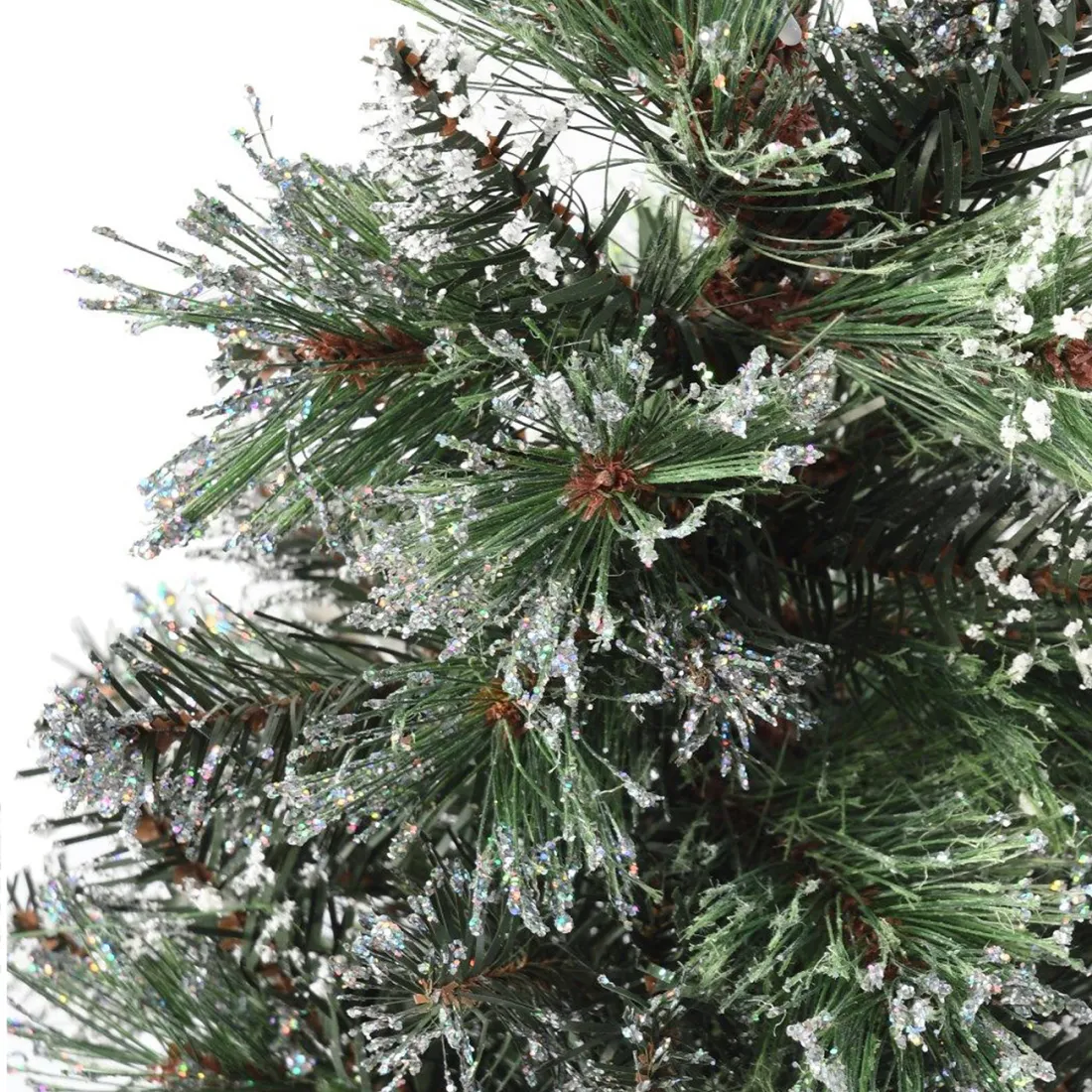 Sapin livré monté pied, socle, tronc et branches. Pour l'installer il ne reste plus qu'à écarter les branchages épineux. Ce joli sapin de Noël est givré mais sans exagération, les épines vertes sont visibles. Le givre additionné d'un léger pailletage accompagnent l'ambiance de fin d'année et les frimas d'hiver. Pour imiter la neige délicatement déposée sur la verdure. L'aspect givré scintillant orne joliment cet arbre de Noël, il peut donc rester dans son état naturel, sans décoration supplémentaire. Sapin de Noël aussi facile à déplier qu'à ranger. Son pot peut être inséré dans un autre contenant plus esthétique ou enrubanné de tissu, papier de crèche ...