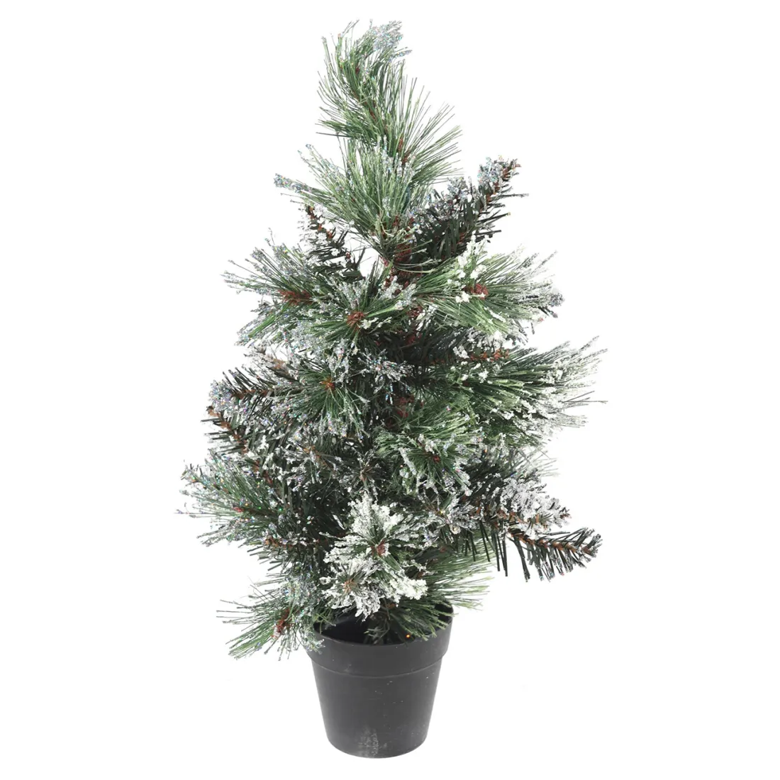 SAPIN MINI GIVRE effet givré et pailleté, aiguilles douces et dures, à la base un pot PVC de diamètre 12,5cm et de hauteur 10,5cm. En une seule pièce. Test inflammabilité : Norme Européenne standard EN 71-2 (sécurité des jouets).