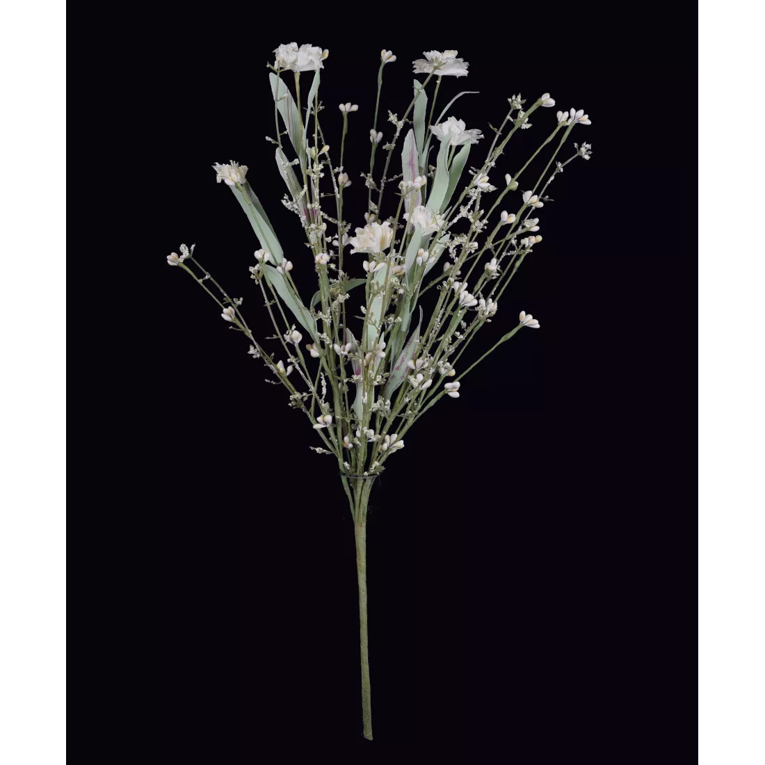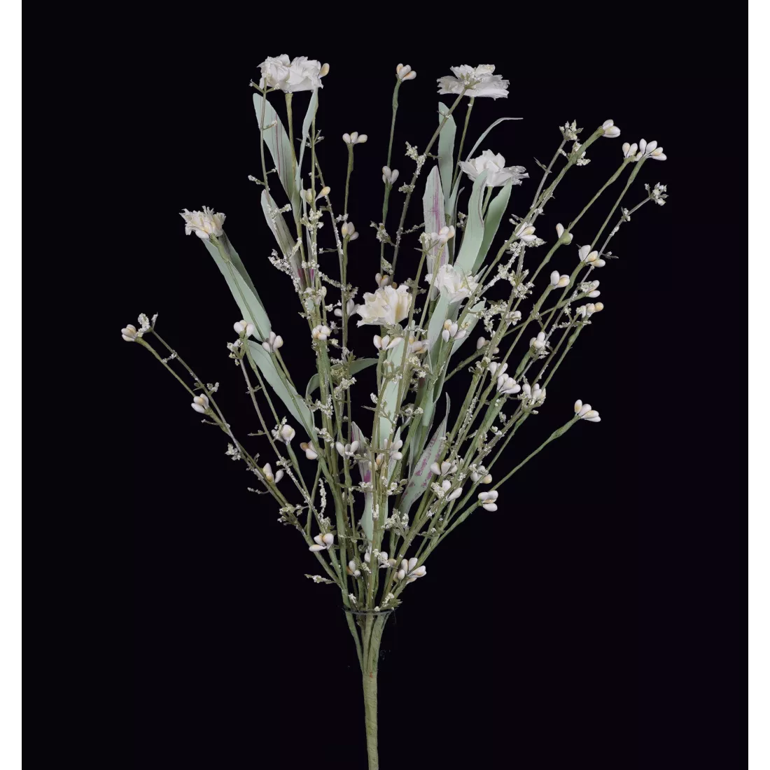Faux bouquet composé de fleurettes champêtres de coloris blanc. C'est un esprit séché, les fleurs sont en tissu polyester, le feuillage en polyéthylène, les baies en polystyrène teinté. Ensemble d'une hauteur totale de 52 cm dont 19 cm de tige.