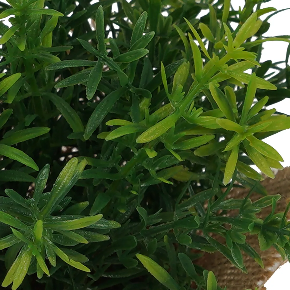 Le buisson est fixé dans un pot en toile de jute, qui mesure 9 cm de hauteur et 8 cm de diamètre. Ce pot en jute ajoute une note rustique à l'ensemble.