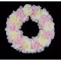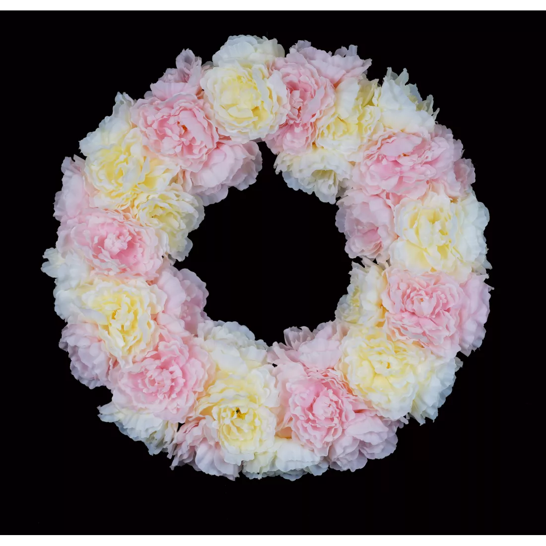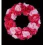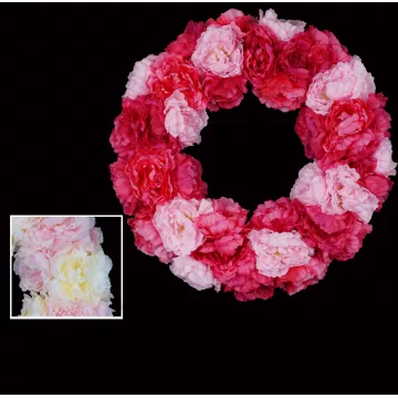 Couronnes de fausses pivoines tendance. Deux couleurs de composition, fushia/rose pour un effet pétillant, et rose clair/crème pour un effet plus doux/romantique. Les utilisations sont multiples: décoration de salle pour les festivités, les cérémonies de mariage par exemple; encadrement d'un miroir intérieur, mise en valeur de vitrine, exposition en guise de tableau ... Ces couronnes peuvent être suspendues ou posées à plat. Le support est en polystyrène, il est donc possible de rajouter et de piquer quelques feuillages, branchages, ou quelques baies parmi les nombreuses pivoines factices.