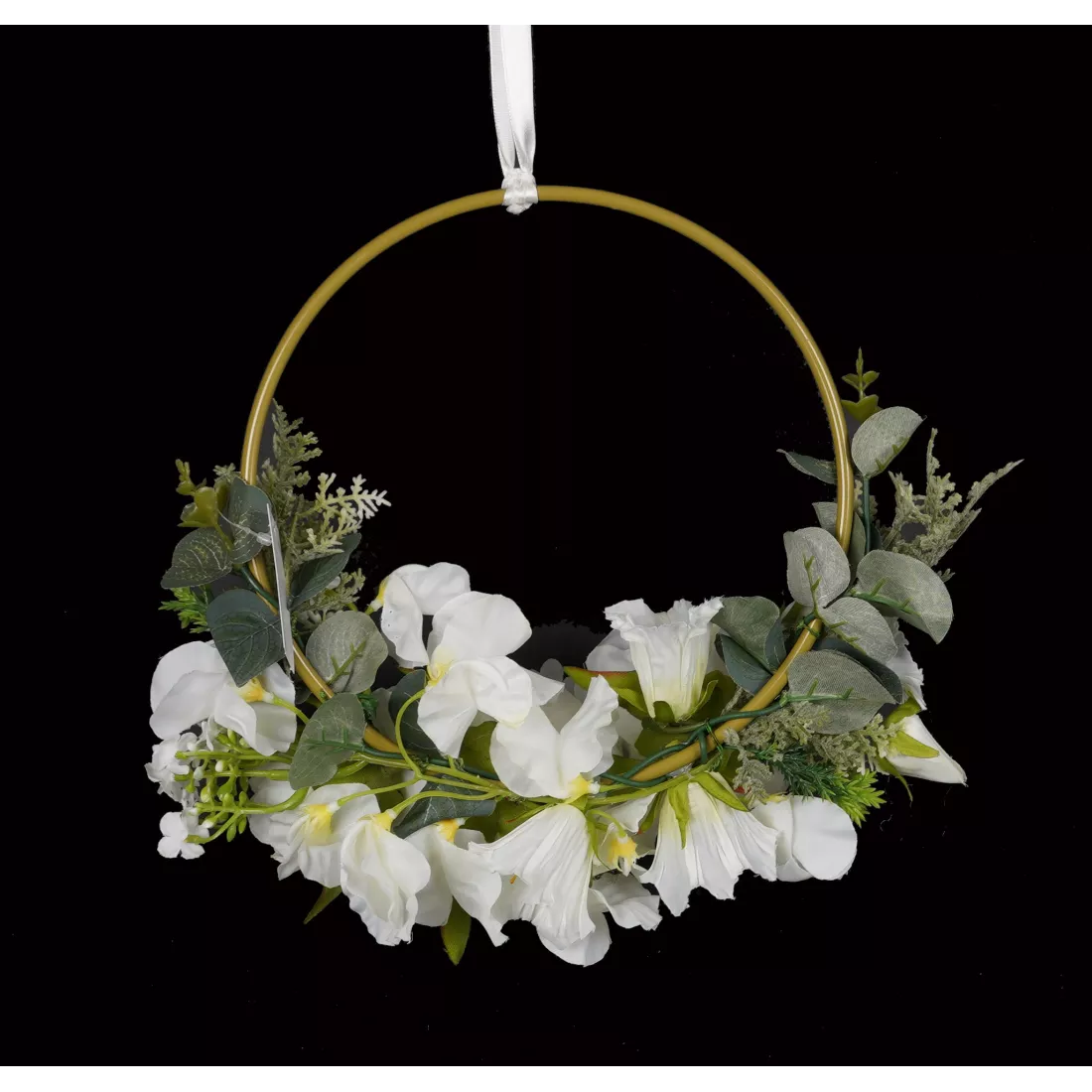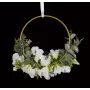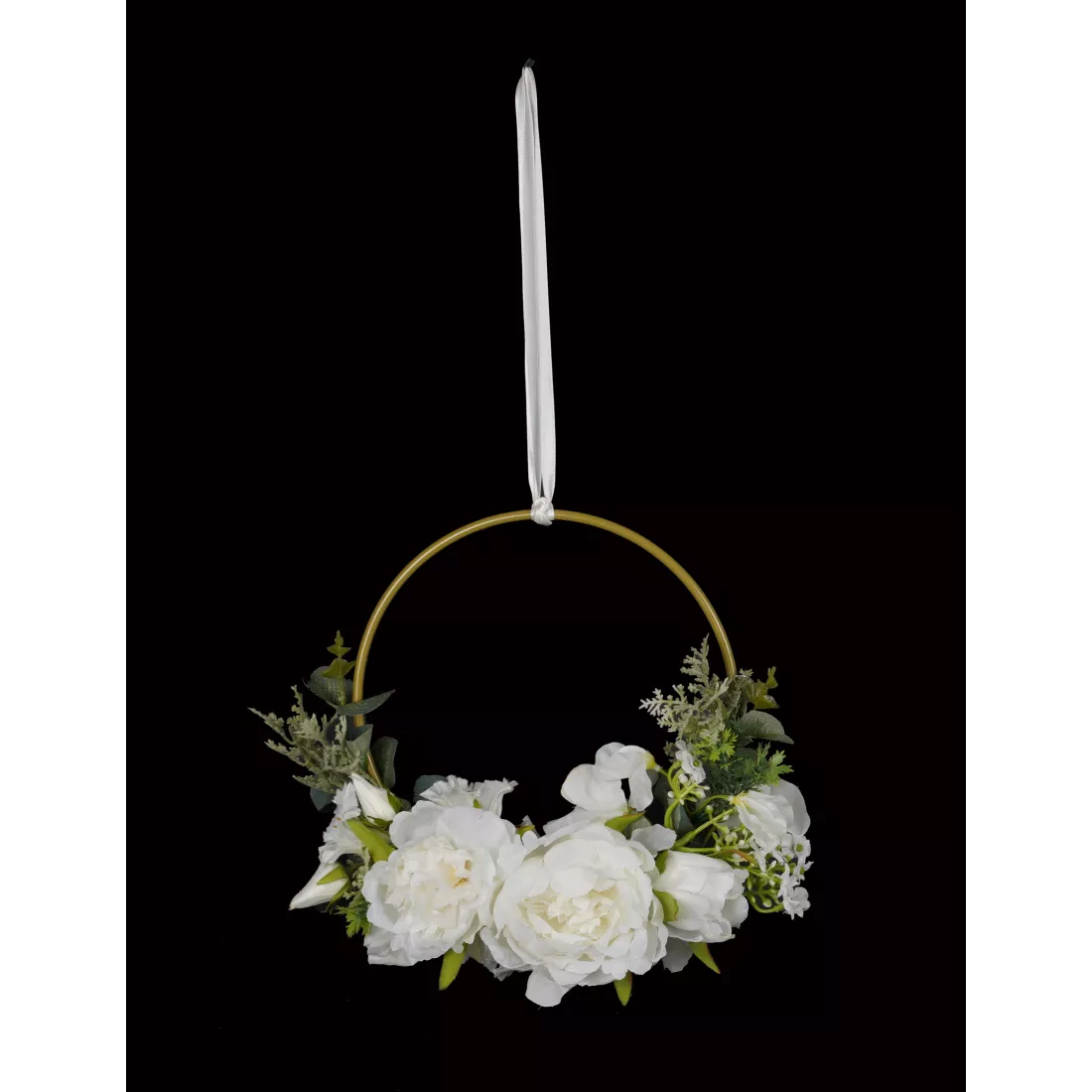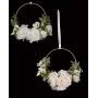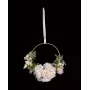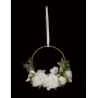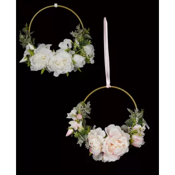 Cette couronne est déclinée en 2 coloris, blanc ou blanc rose. La composition en demi cercle, est créée à partir de pivoines, eucalyptus, cinéraires vert/gris, pois de senteur, pétunia et mini fleurettes. Chaque anneau est orné d'un ruban en tissu assorti aux fausses fleurs (rose ou blanc) afin de pouvoir l'accrocher ou le suspendre. Romantique, décoratif, dans la tendance actuelle.