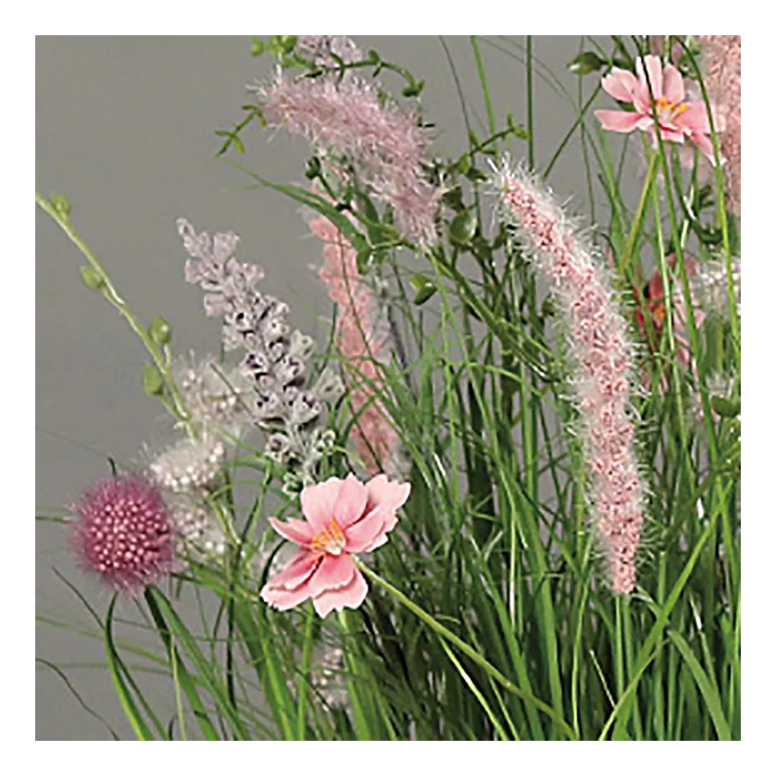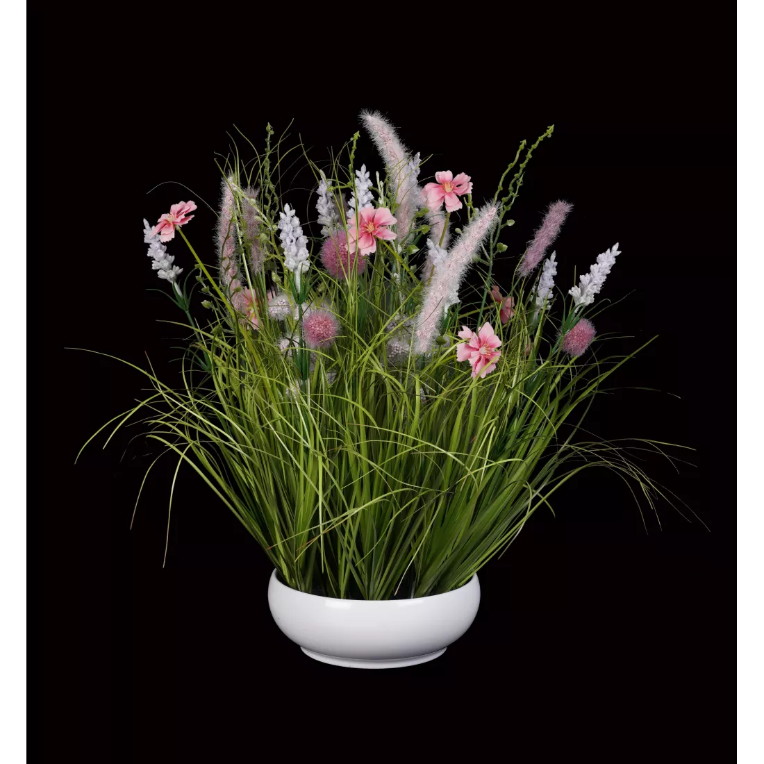 Composition décorative de fleurettes des champs réalisées dans une coupe ronde blanche en pvc de qualité. Plein de fraicheur cet ensemble correspond à la tendance du moment en arborant un style végétatif naturel et verdoyant. Mélange de fleurs printanières et estivales : cosmos, graminées, pompons colorés, et herbes. Existe en blanc.