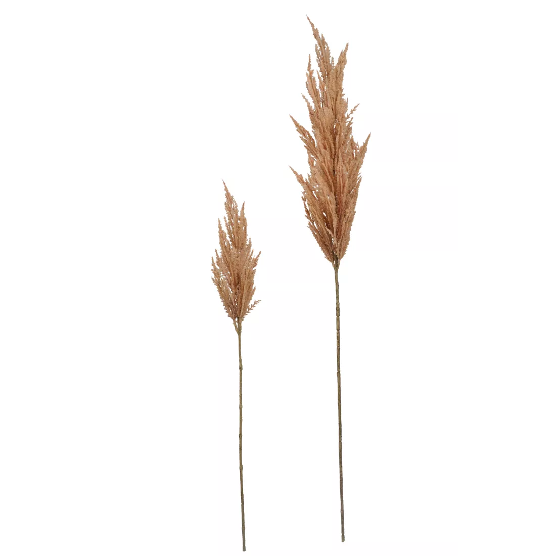 deux grands modèles de Pampa artificielle pour un coloris pêche saumoné. Esprit sec est formé par des brindilles légèrement épineuses recouvertes de flocage en nylon teinté. La plante herbe de pampa naturelle est à connotation ornementale au feuillage fin et abondant, les plumeaux artificiels le sont tout autant pour la décoration intérieure.