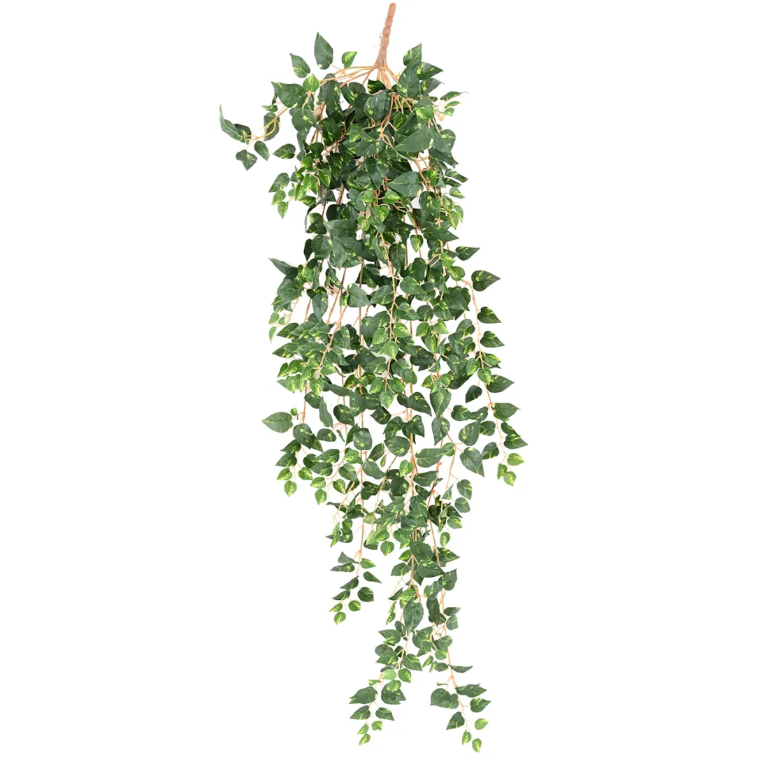C'est un joli Pothos au feuillage de petite dimension coloré comme le vrai Pothos, vert et jaune clair. Les tiges marron clair se modulent afin de donner à la fausse plante verte un aspect tout naturel. Pas de soucis d'entretien avec une plante artificielle. Sans avoir la main verte, le faux Pothos amène un petit coin de verdure toute l'année dans la cuisine, dans un bureau, dans un hall d'accueil, ou toute autre pièce dépourvue de luminosité. Deux longueurs de tombant sont proposées, 70 cm et 110 cm.
