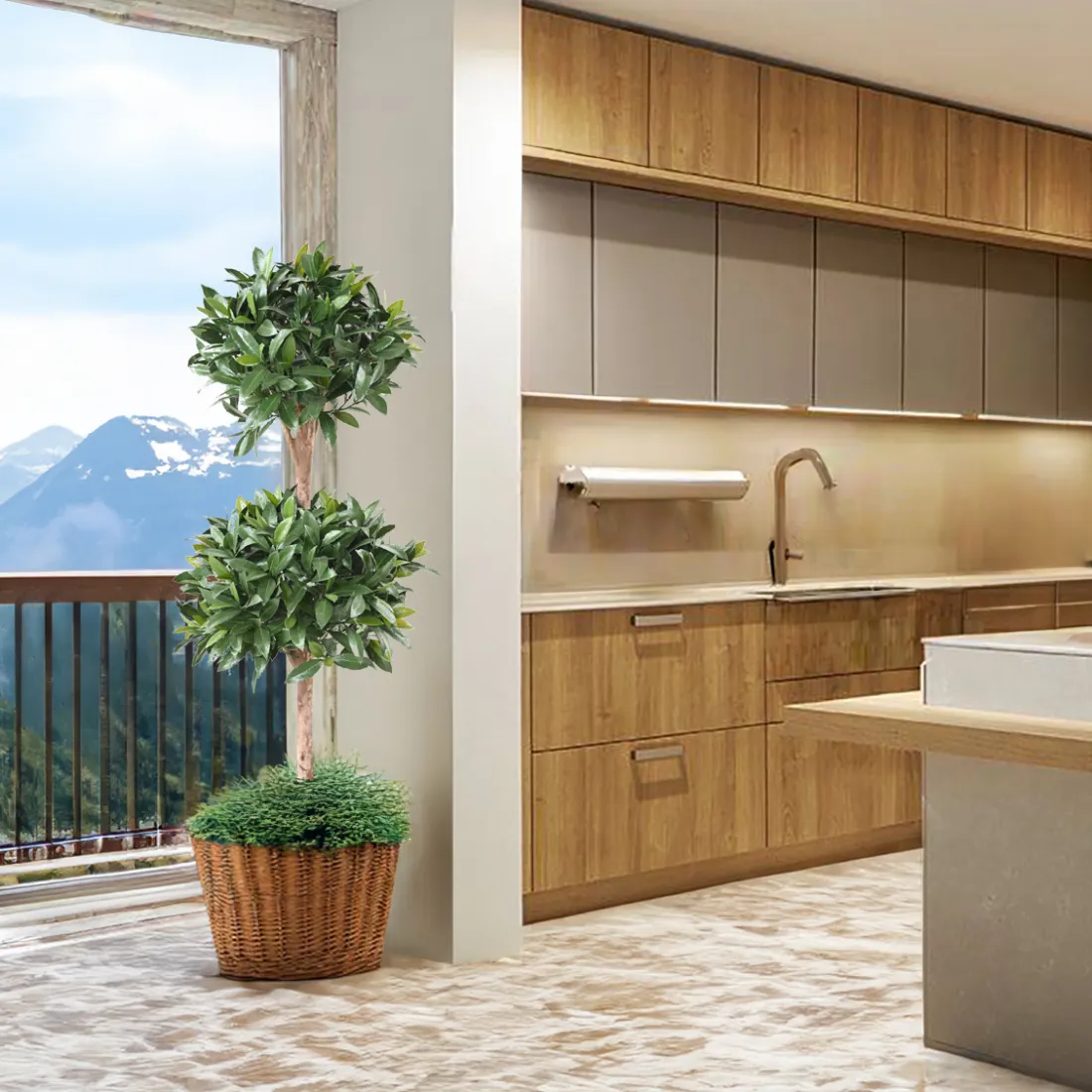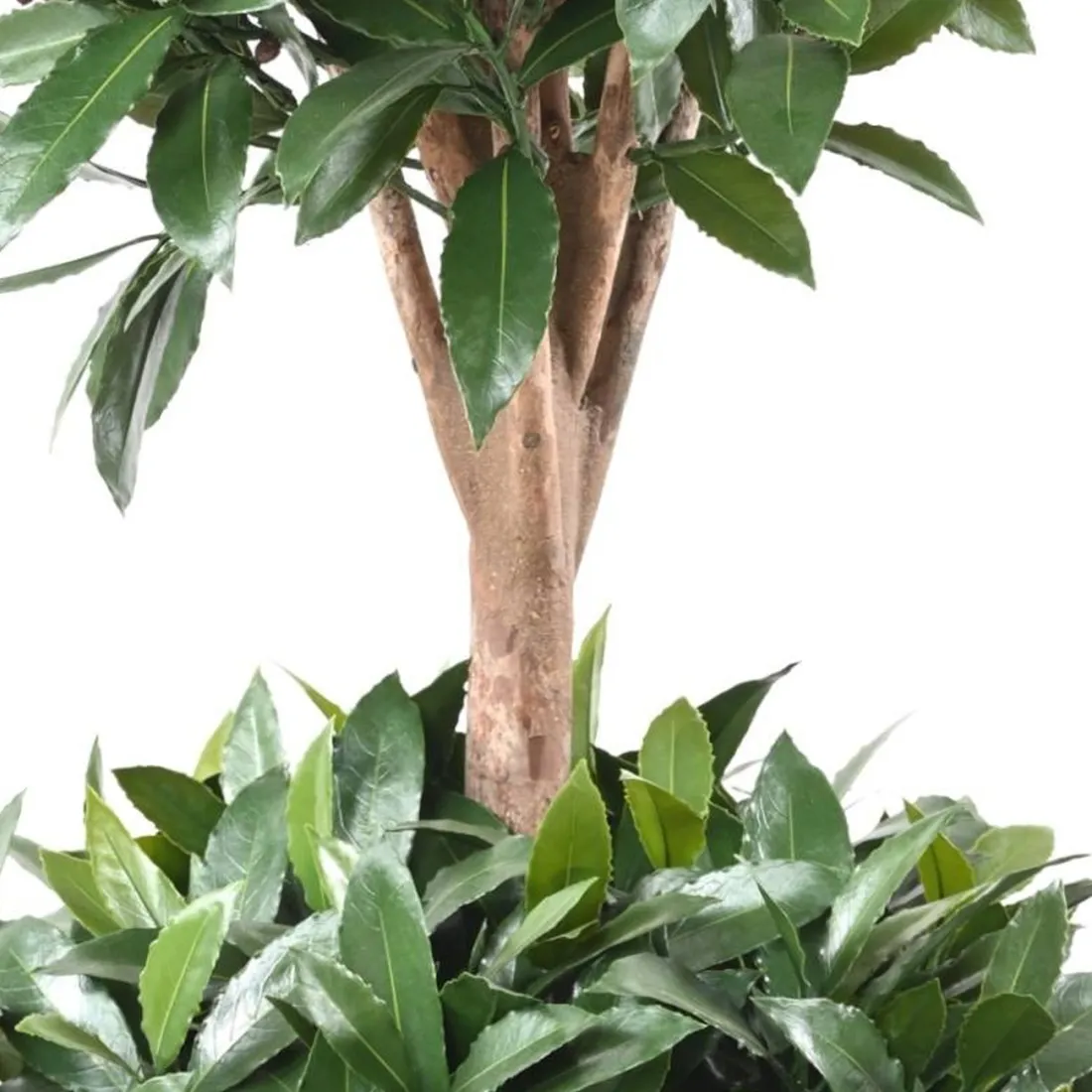 Ce laurier sauce artificiel double boule a un Tronc en bois et un feuillage en polyéthylène, matière plastique. Livré dans un pot plastique lesté. ( plantes artificielles ).