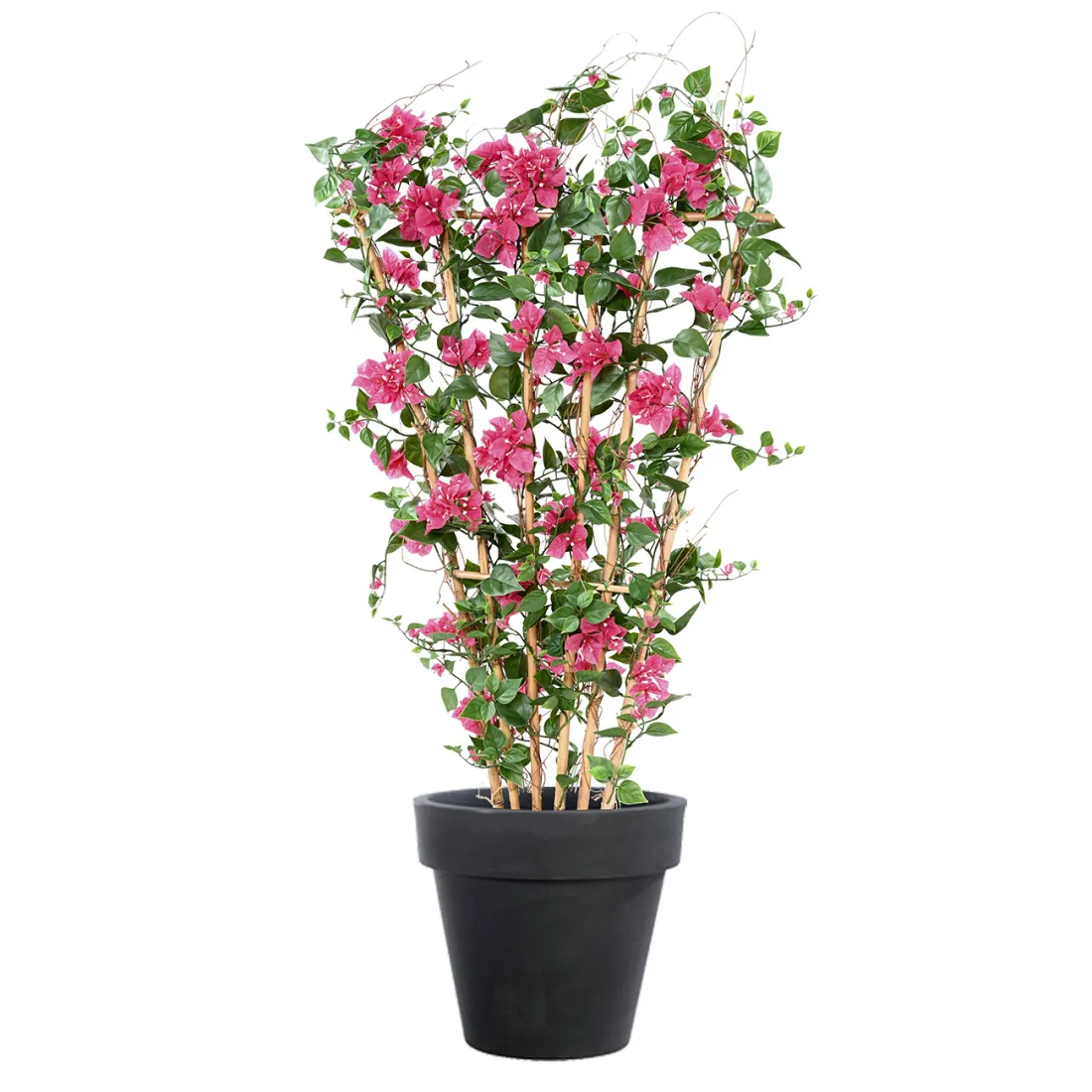 Bougainvillée Haie artificiel ( plantes artificielles) composé d'une structure de 6 cannes, d'un feuillage et de fleurs en plastique. Cette palissade mesure 140 cm de hauteur et 70 cm de largeur au plus large. Livré dans un support de plantation, pot pvc Fleurs artificielles fuschia