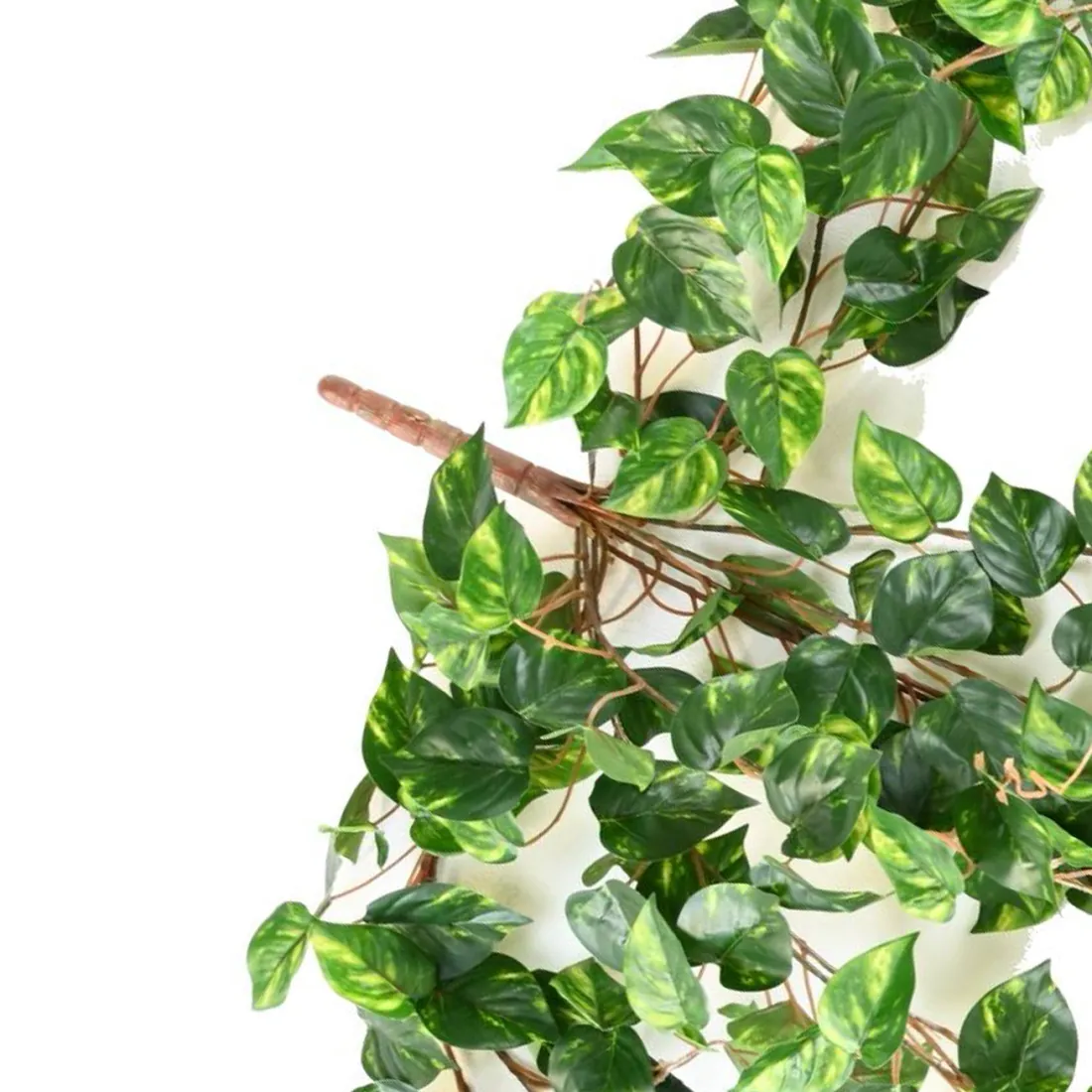 Plante factice retombante de pothos de 2 mètres de longueur. Elle est composée de plus de 1000 feuilles vert nervurées vert clair, en tissu polyester Tergal de différentes tailles, pour plus de naturel. Elles sont fixées sur des tiges métalliques recouvertes de PVC marron. Le pothos au feuillage artificiel panaché répond à la tendance déco du moment. En effet, les feuilles composées de plusieurs coloris ont le vent en poupe !