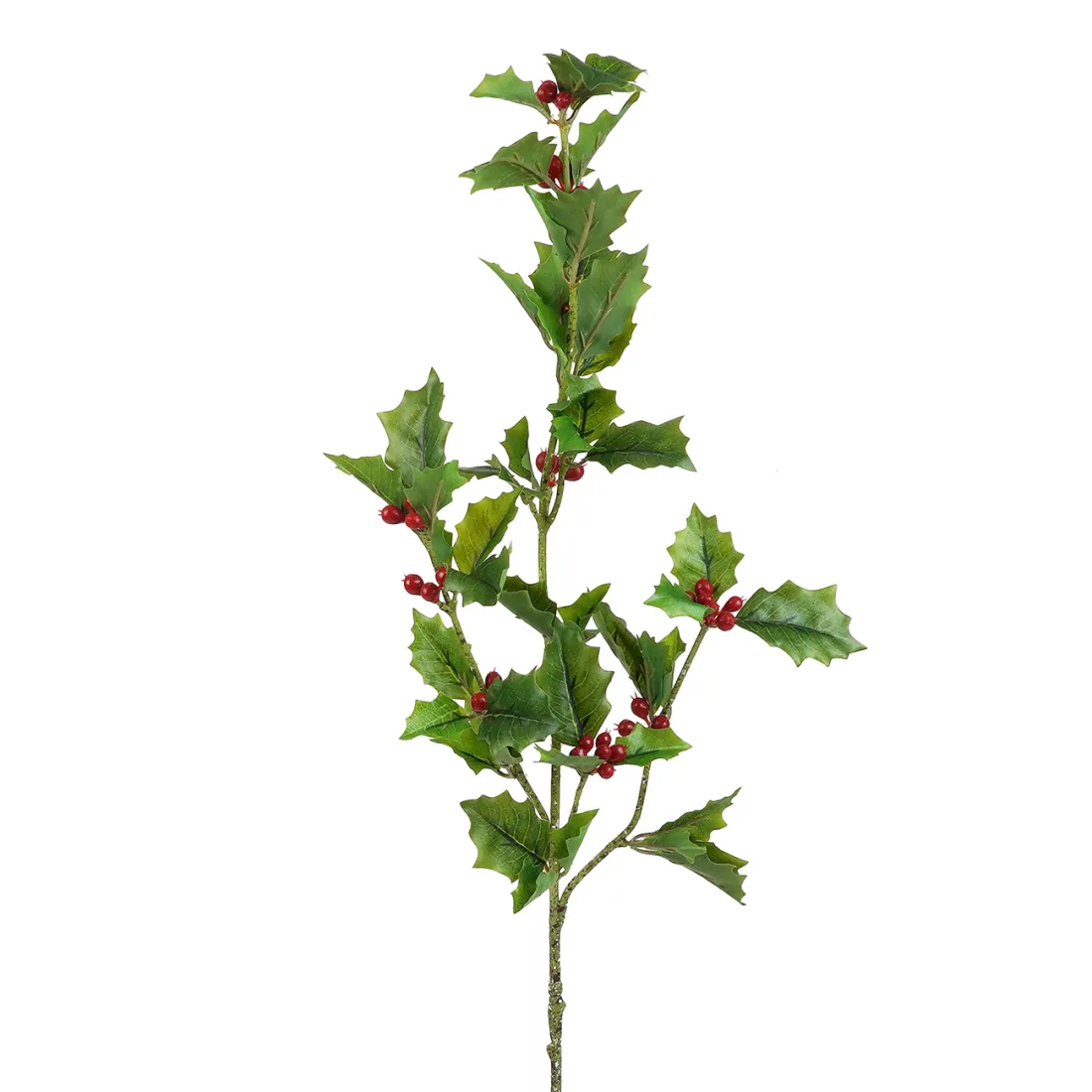 Branche de houx factice; le feuillage vert est réalisé avec une matière plastique novatrice très fine, qui ressemble de manière étonnante au tissu polyester habituel. Les nervures des feuilles sont bien marquées. La tige verte est chamarrée de plusieurs coloris pour imiter les branches naturelles. Les baies positionnées en petits groupes, tendent vers un rouge mat carmin.