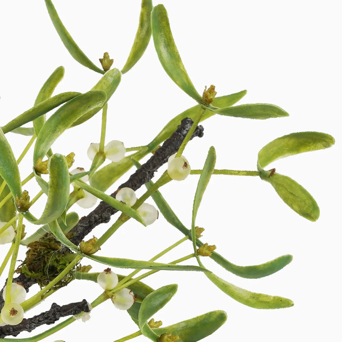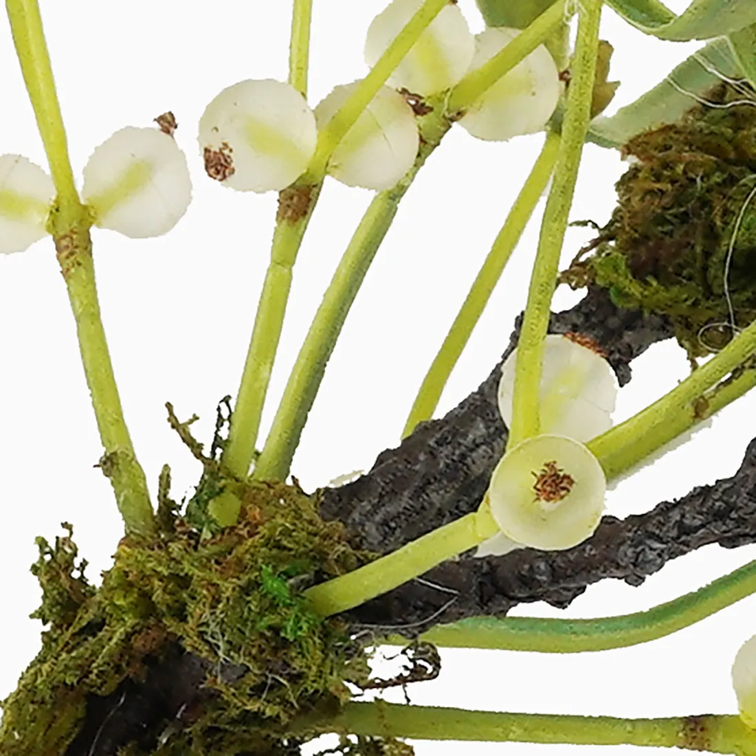 Tout est réussi pour cette branche de faux gui. Le bois arbore des détails devenus rares dans la fabrication des plantes artificielles. Le coloris est véridique marron foncé, et les aspérités, rugosités du rameau sont parfaites. La mousse collée sur la branche rajoute un plus à l'imitation. Les feuilles sont bien découpées, les pétioles du feuillage se modulent pour donner la forme voulue. Les fruits du gui sont translucides et opaques, pour un réalisme incroyable.