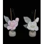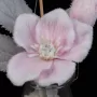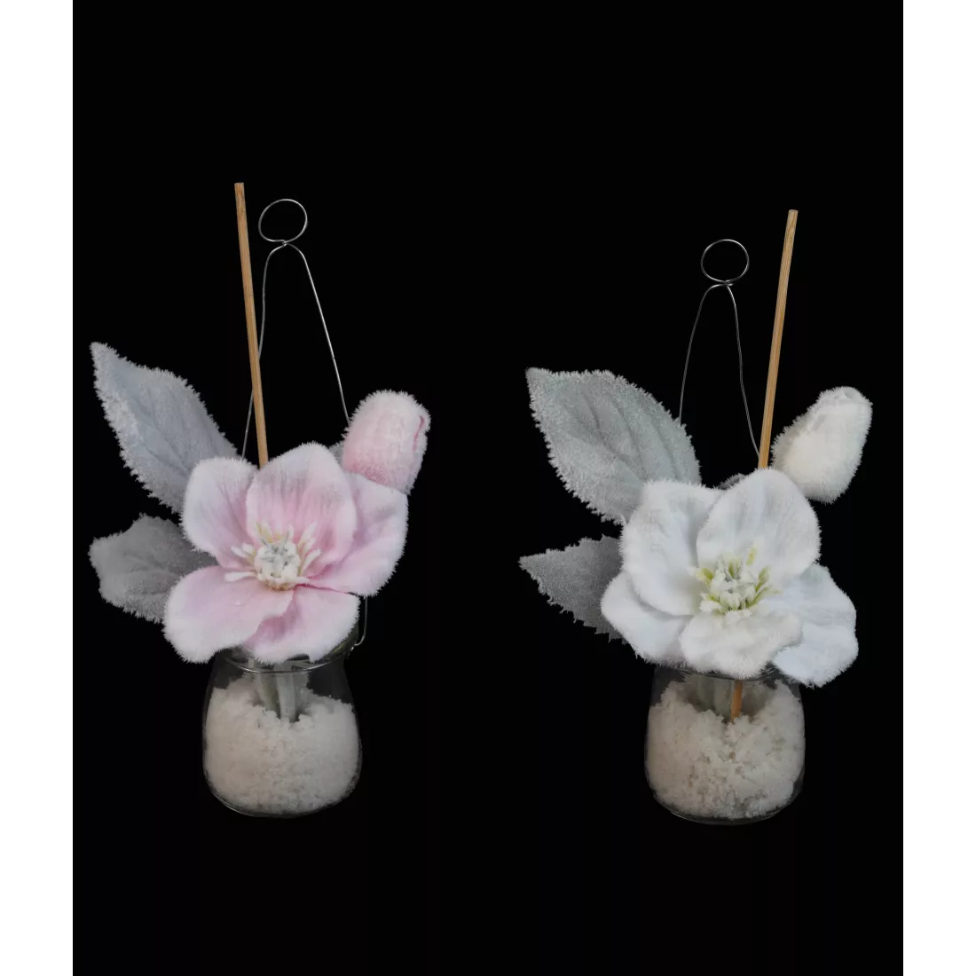 Fleur d'Hellébore et feuillage en tissu recouvert de flocage duveteux blanc. L'ensemble est fixé dans une pot en verre rempli de fausse neige solide. Une accroche métallique couleur argent, permet de suspendre ces petites compositions florales si vous le souhaitez. Elles sont tout aussi décoratives posées. Les deux couleurs peuvent s'associer et être positionnées côte à côte. Parfaites pour amener d'autres coloris pour la période de fin d'année, ces Hellébores sont aussi de jolies fleurs déco, qui embellissent les intérieures toute l'année.