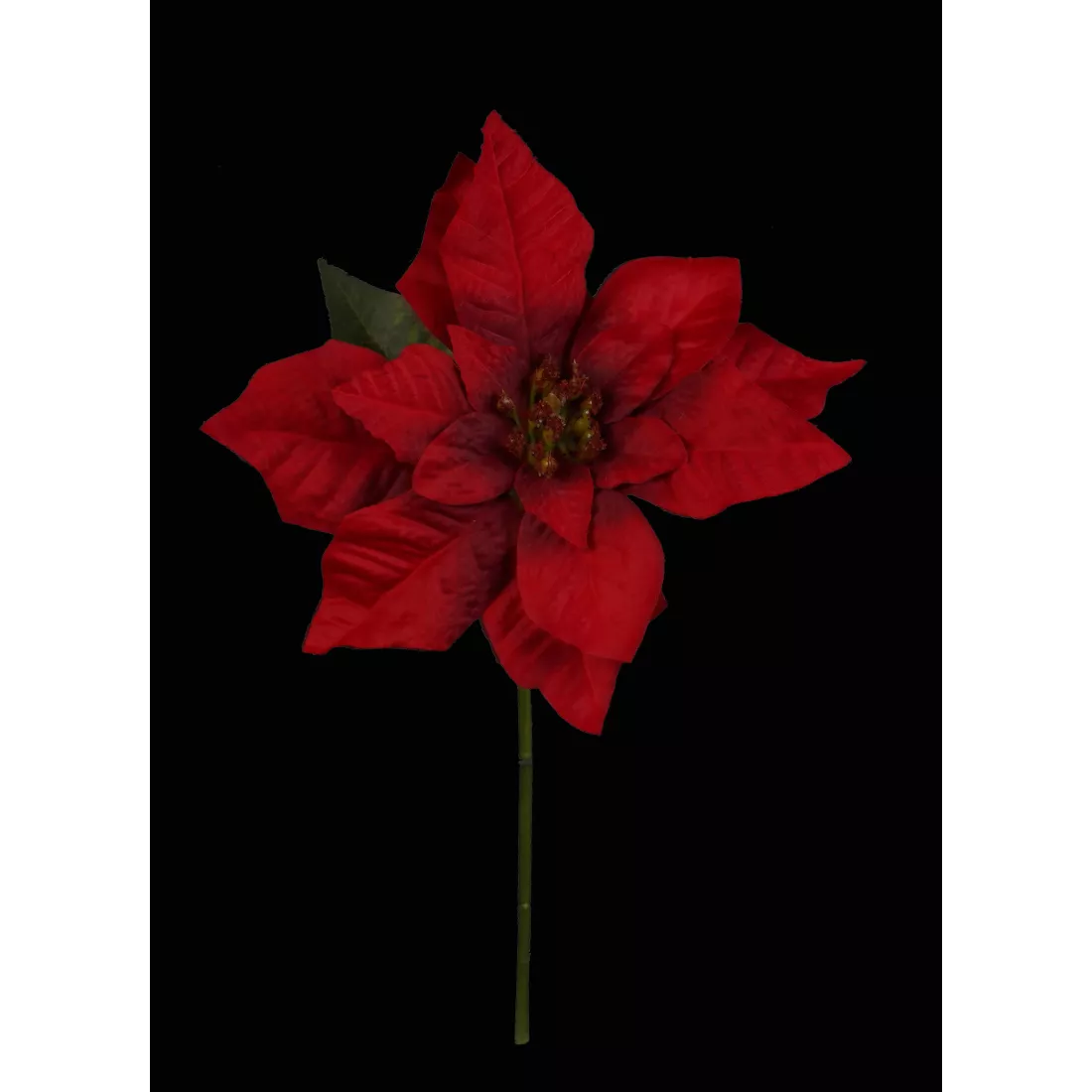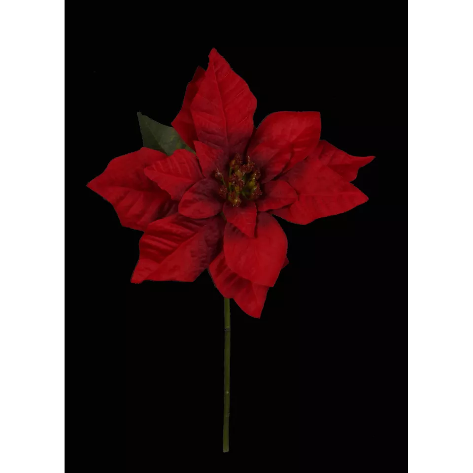 Très difficile à garder la plante naturelle de Poinsettia est pourtant décorative et chaleureuse. La fleur de Poinsettia est en fait un ensemble de feuilles vertes qui changent de couleur au fur et à mesure de la floraison. Cette tige de Poinsettia est fabriquée en tissu, les pétales sont bien découpés, gauffrés pour imiter les plis et les nervures de la vraie plante. La couleur rouge est dégradée pour être plus véridique. Le coeur possède est floqué pour ressembler au pollen déposé sur les étamines.