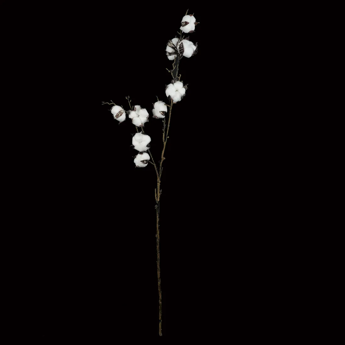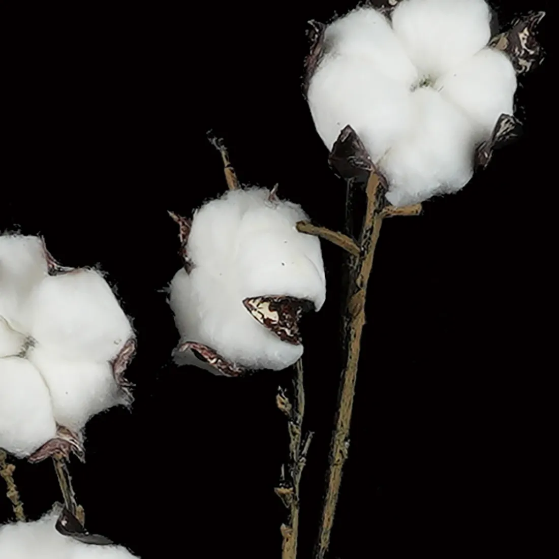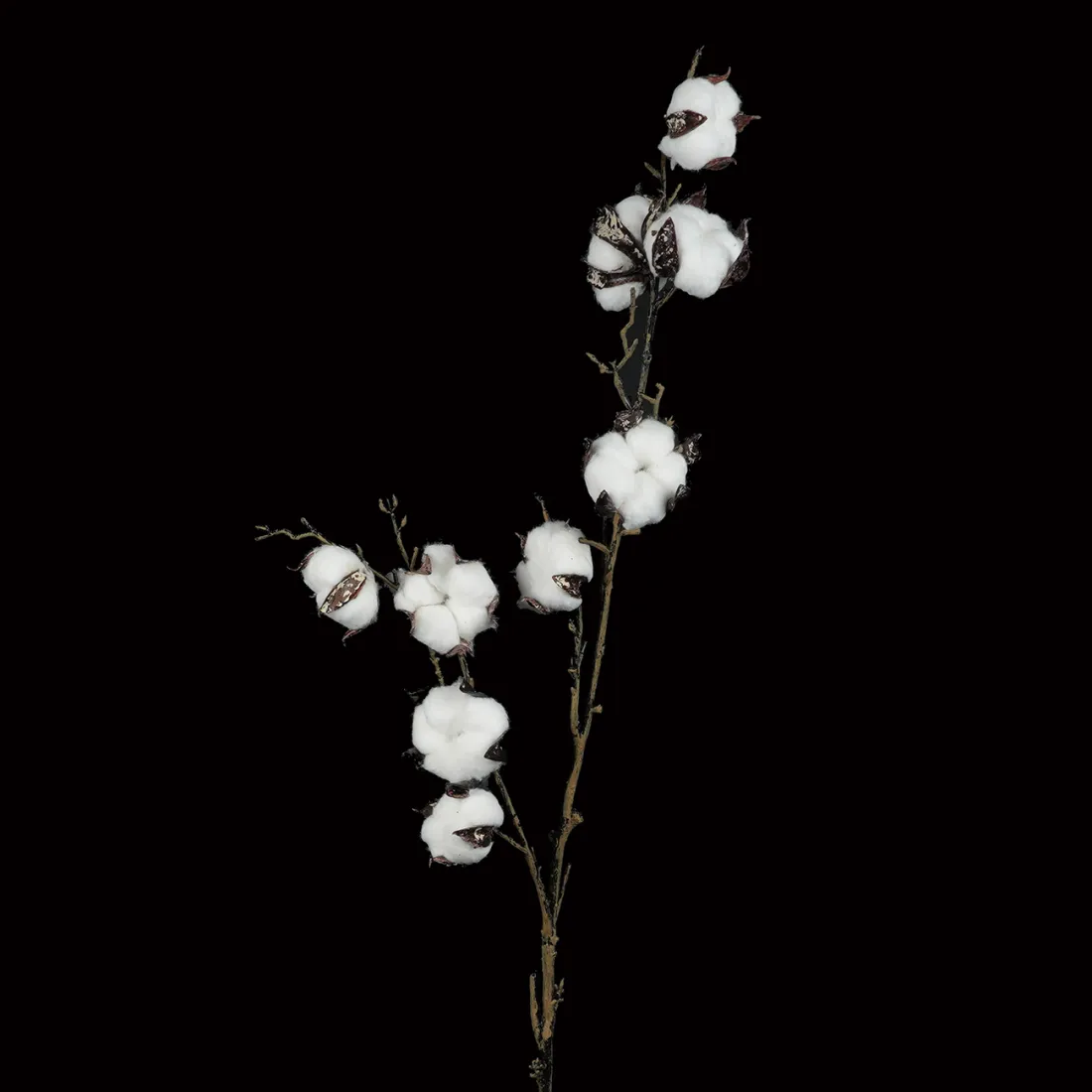 Cette branche de coton est plus grande que les tiges que l'on trouve habituellement en sec, ce qui facilite l'élaboration de faux bouquets plus majestueux. Elle est aussi plus modulable, vous pourrez donc mieux l'adapter à la forme que vous souhaitez. Tordre avec délicatesse. Le coton est joli présenté avec des feuillages comme ceux de l'Eucalyptus, du Ginkgo, de l'érable vert ou automnal, des baies, mais encore avec des fleurs esprit séché ou des fleurs du jardin artificielles comme les roses, les dahlias et les cerisiers.