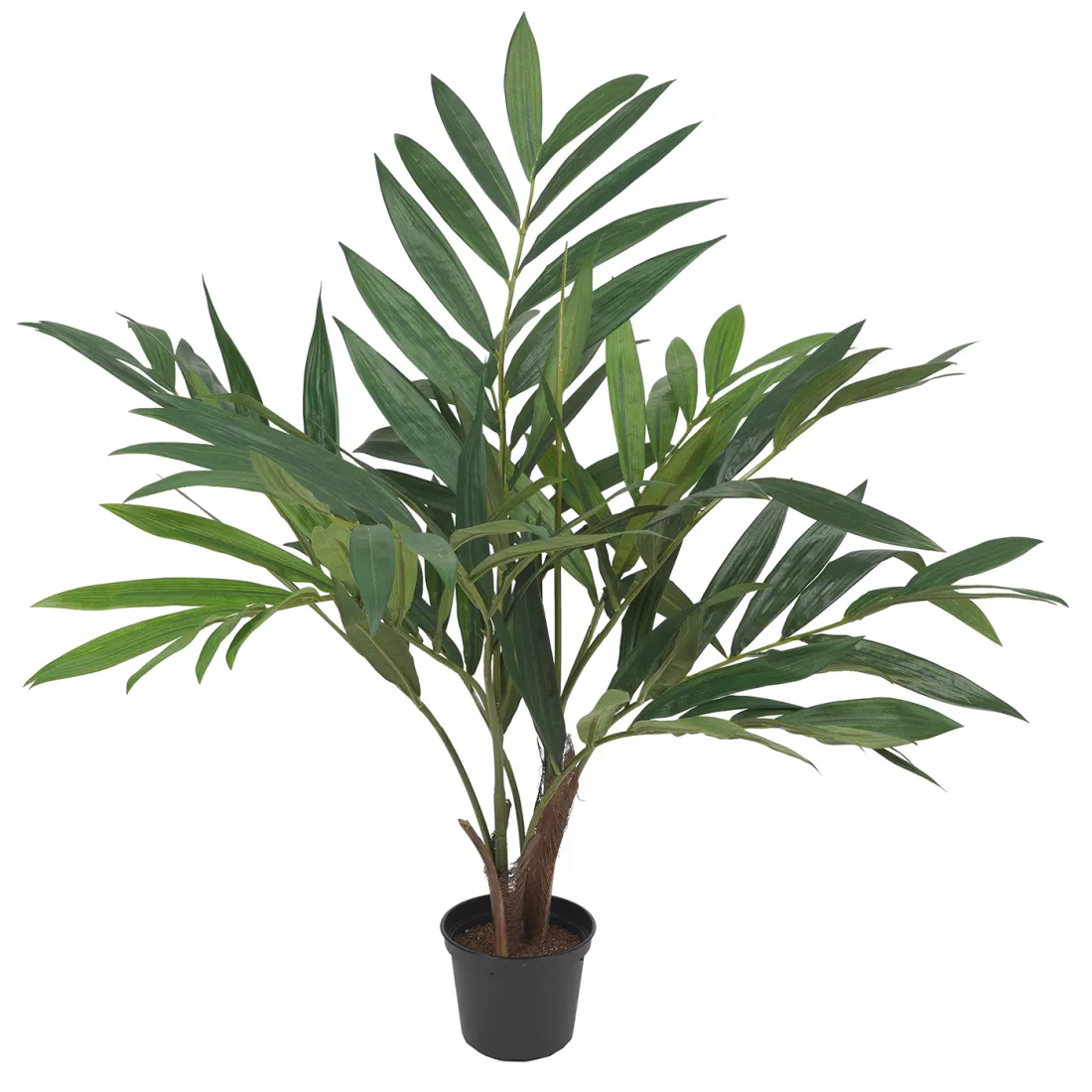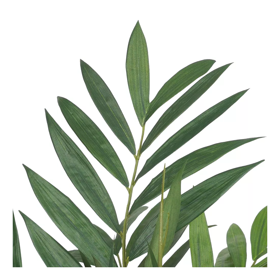 Ce petit palmier artificiel est composé avec 2 tiges de feuillage synthétique et de vraie fibre, pour assurer le réalisme. Les feuilles palmées et découpées sont en forme de plume. La longueur de la plus grande palme fait 47 cm tige comprise. Le Parlour naturel est originaire d'Amérique centrale et fait partie de la famille des palmiers Chamaedorea. Il persiste en forêt chaude et humide, c'est pourquoi, chez nous, il est cultivé en intérieur; c'est une plante de nos maisons. Toutefois difficile à garder, la solution pour une durée dans le temps, est de posséder une belle imitation sous forme de palmier Parlour artificiel. Très décoratif, vous pouvez le planter seul dans un joli pot de diamètre 15 à 20 cm.