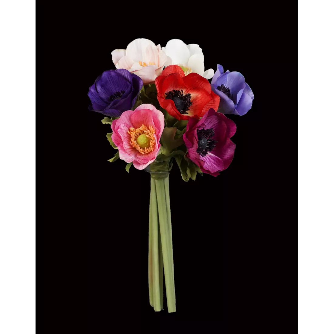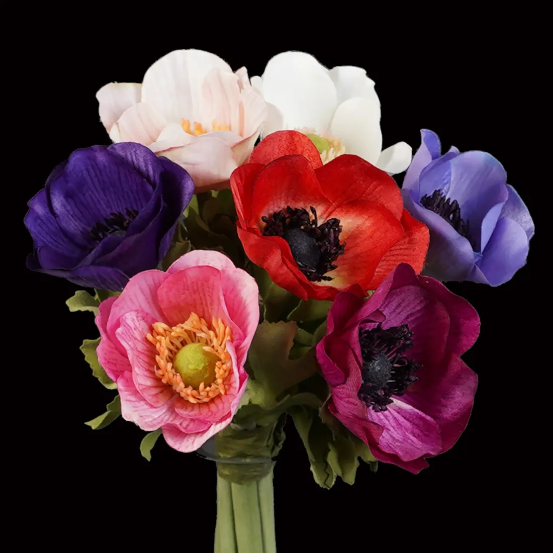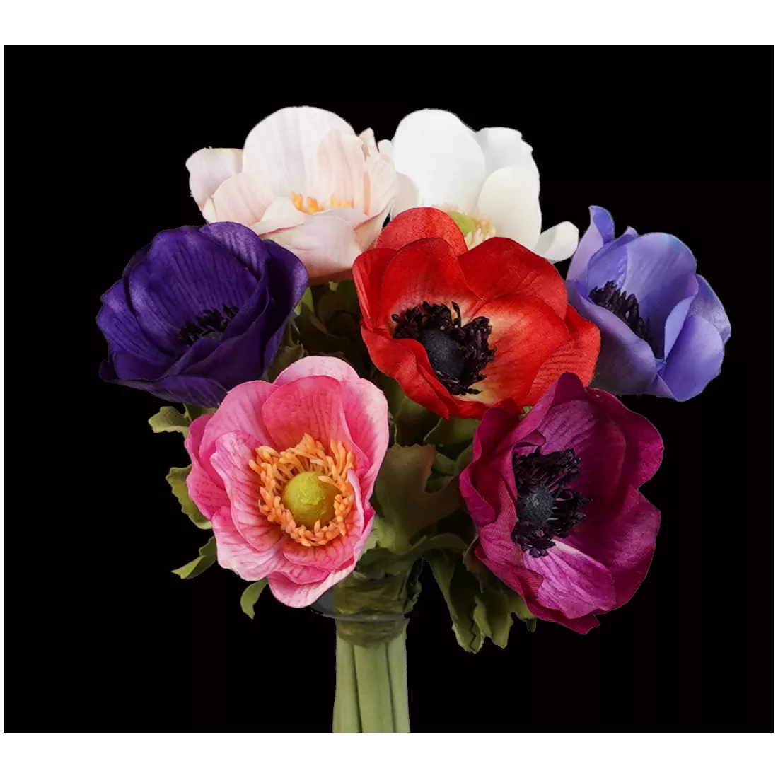 Les Anémones sont des fleurs très simples, avec peu de pétales; mais elles sont délicates et proposent des multitudes de couleurs chatoyantes. Ce bouquet de fausses anémones en tissu est formé de 7 tiges fleuries liées par un ruban vert. Si nécessaire, les anémones peuvent être utilisées séparément. Chaque fleuron de 5 à 6.5 cm de diamètre, possède un coloris différent: du blanc, au rose, jusqu'au violet foncé lumineux. L'Anémone des jardins se compose en bouquet avec des feuillages légers comme les feuilles de Murraya, et des fleurs de même saison comme des tulipes artificielles, des jonquilles artificielles, ou des faux cerisiers en fleurs.