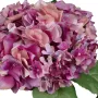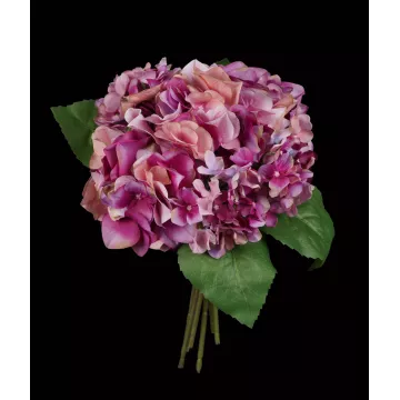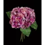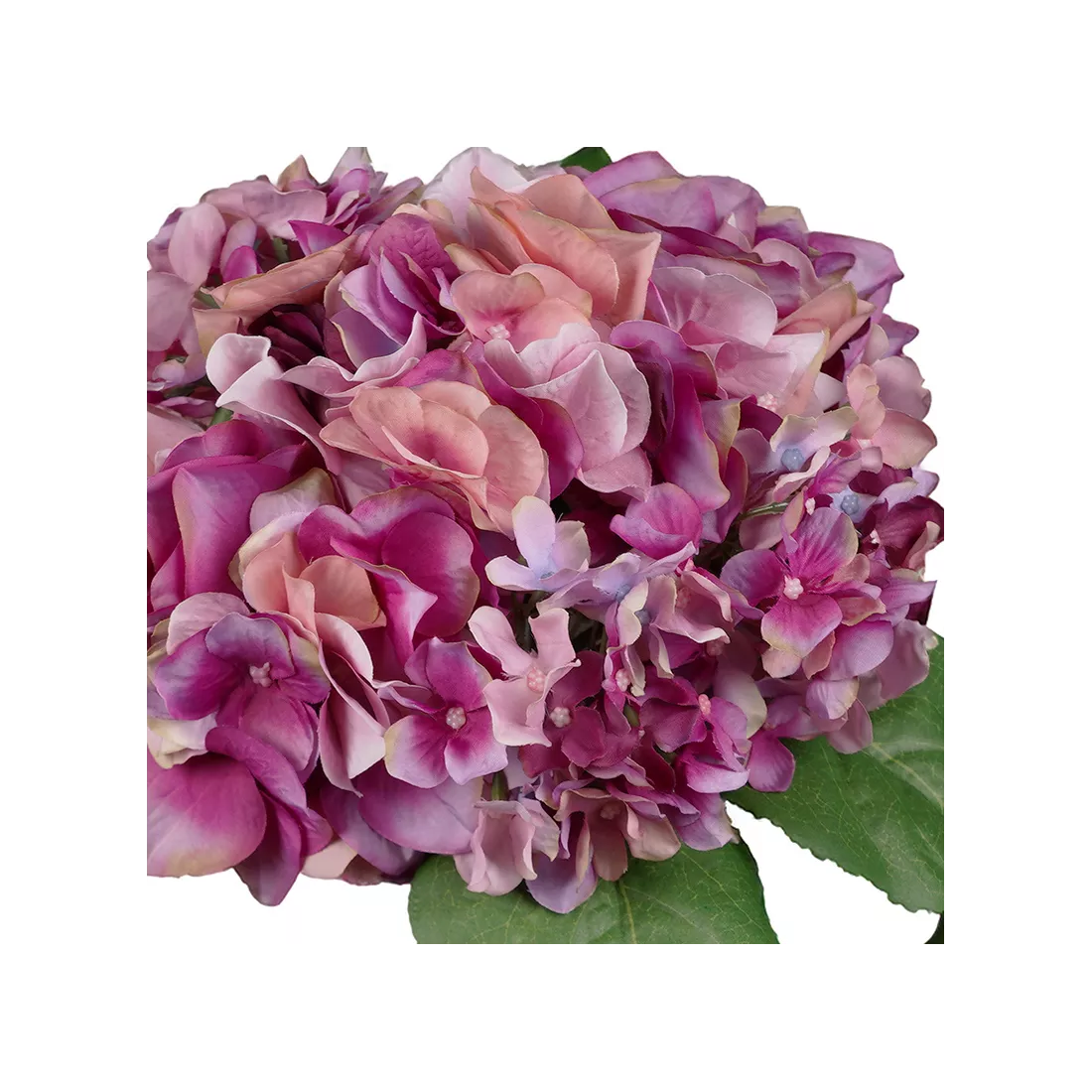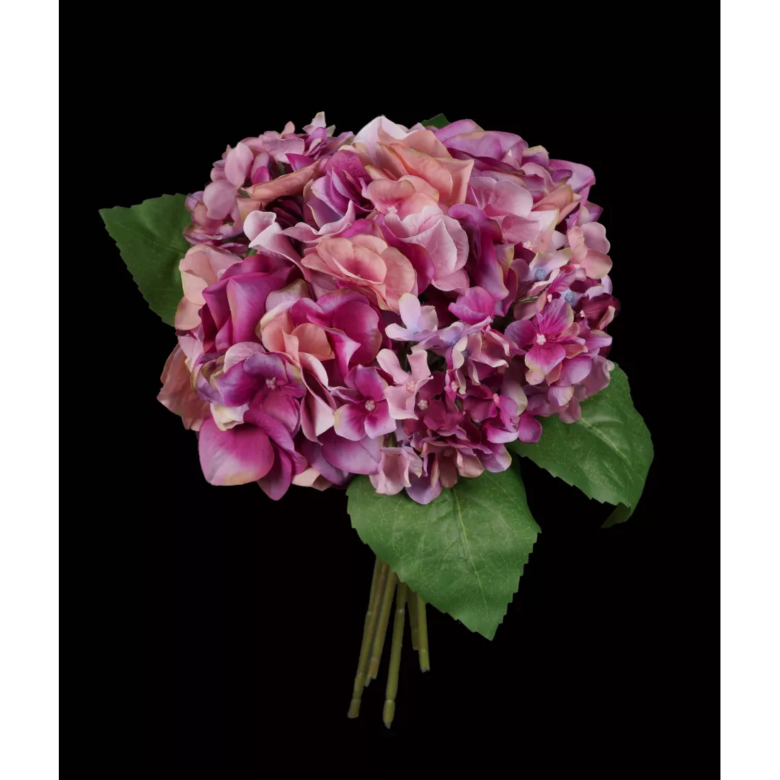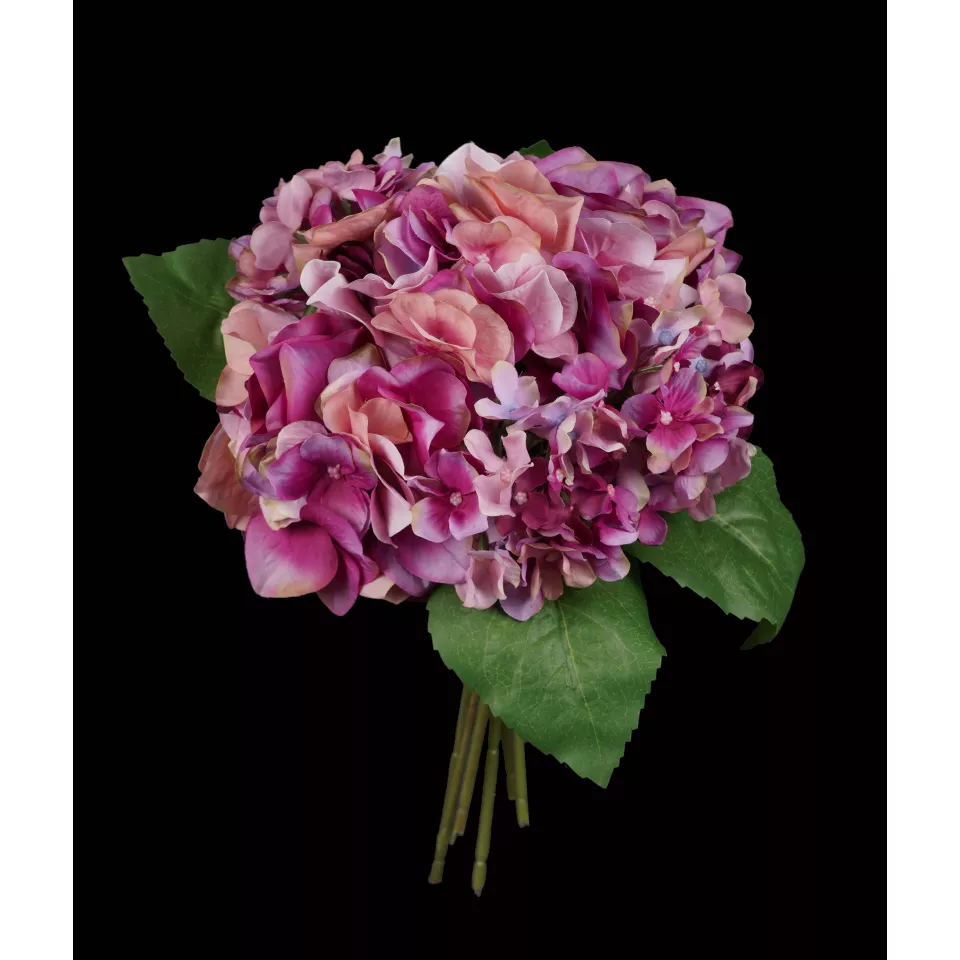 Les fleurs d'hortensias naturels sont rarement unies; les tons sont souvent nuancés sur une même tête fleurie. Afin de satisfaire au mieux une réalité de floraison et un besoin décoratif, ce bouquet artificiel présente un dégradé de plusieurs tonalités de rose. Les fleurons vont du rose poudré au rose violet. Quelques feuillages synthétiques entourent les fleurons. Pour des besoins créatifs, le bouquet artificiel d'hortensia peut être divisé en 6 tiges de fleurs plus petites.
