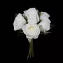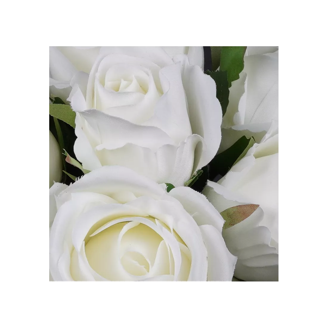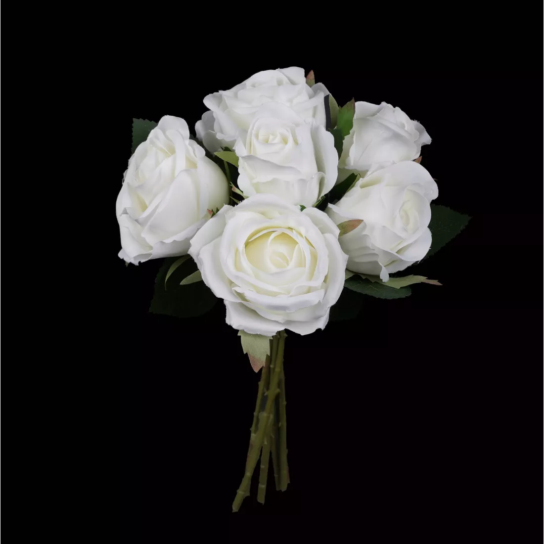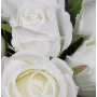Les fausses roses blanches sont incontournables. ce bouquet de fleurs artificielles présente 3 roses tissu en bouton semi-ouvert, accompagnées de 3 roses ouvertes. Quelques feuilles synthétiques de rosier sont ajoutées en corolle. Belle finition de l'ensemble fleuri.