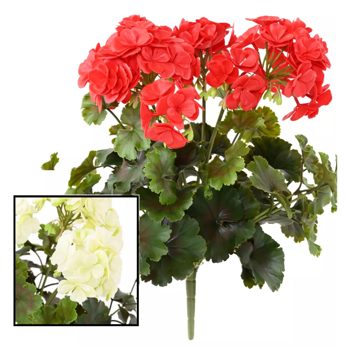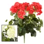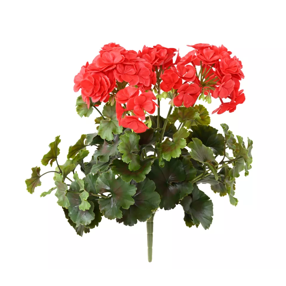 Ce géranium artificiel est en matière plastique contrairement aux géraniums artificiels plus classiques fabriqués en tergal. le tissu peut tout à fait être installé dehors, mais la résistance sera un peu moins longue à l'extérieur. Ce géranium plastique n'a rien à voir avec les anciennes fleurs peu qualitatives visuellement parlant. Ce modèle possède de belles feuilles vertes bien découpées et empreintes de détails nervurés. Le bel avantage de ce géranium factice, c'est sa résistance. Il est moins sensible au vent. Si vous préférez les géraniums tombants, dans la même gamme nous proposons un modèle qui chute, dans les mêmes tons, blanc ou rouge vif, ainsi que le géranium plast moins volumineux.