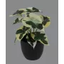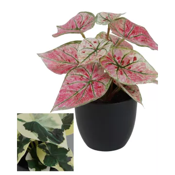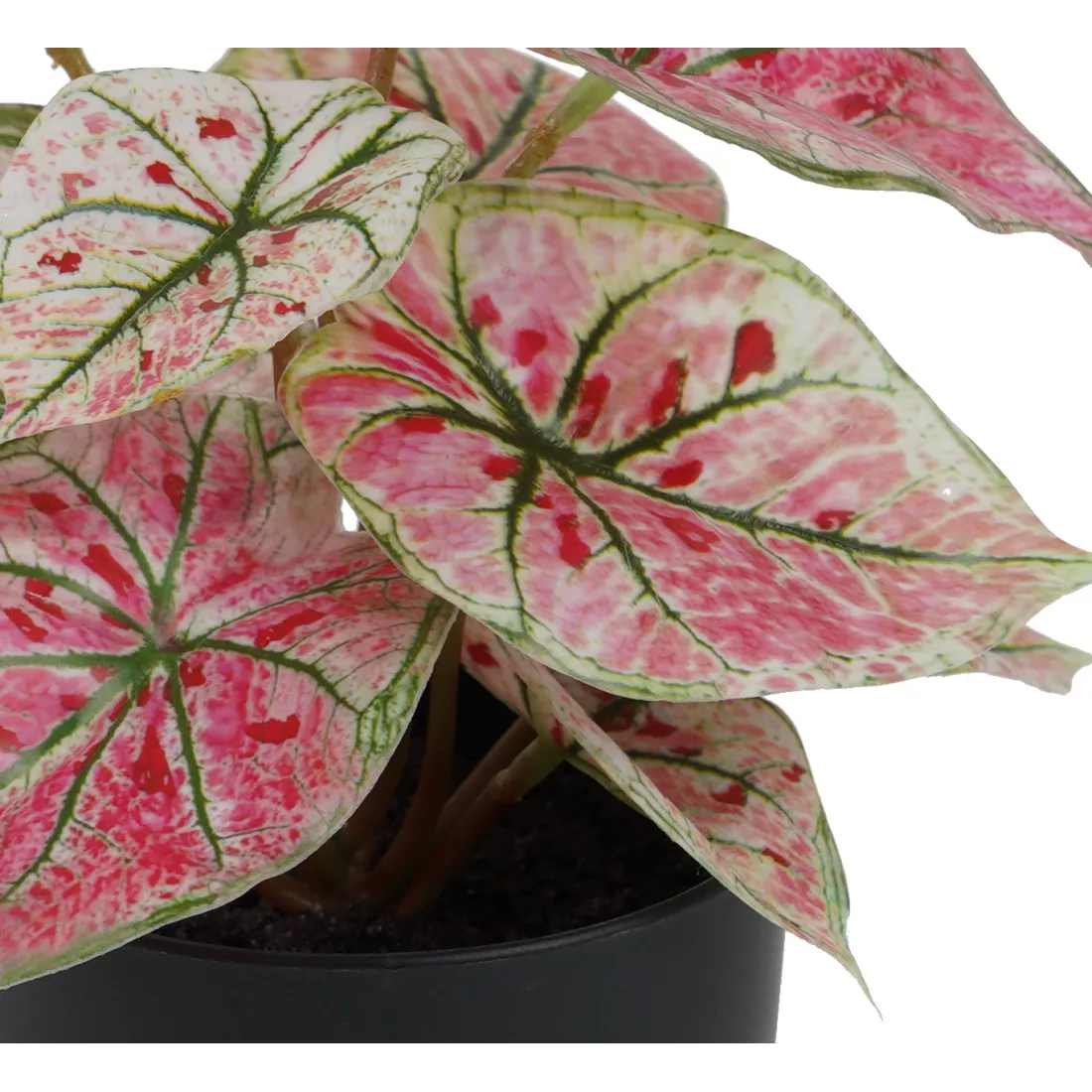 Caldium artificiel mesurant 20 cm de hauteur totale pour une envergure d’environ 20 cm. Plante synthétique feuillage en polymère thermoplastique.  Livré dans un pot plastique noir, mesurant 8.5 cm de hauteur et 10 cm de diamètre.