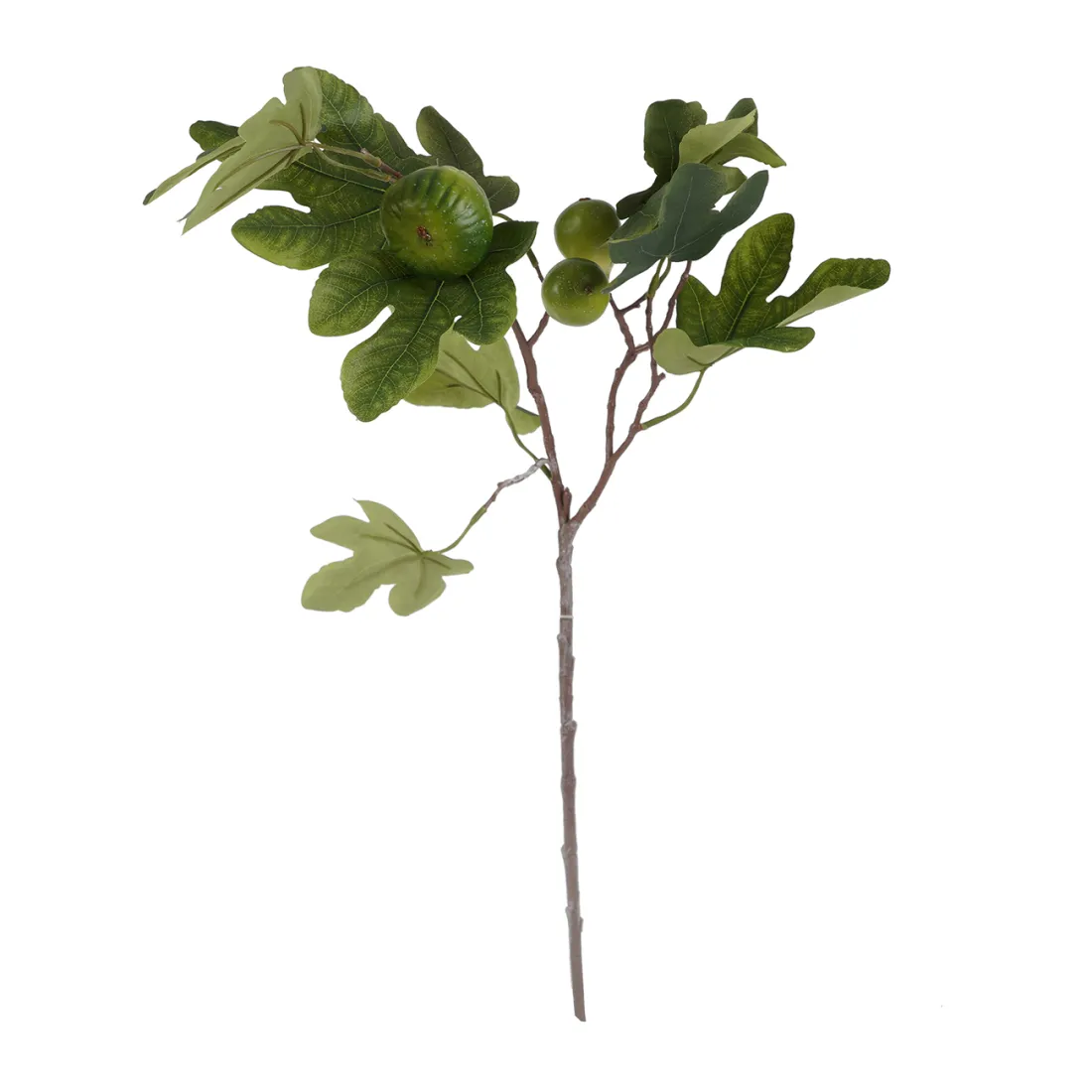 Cette branche de figuier dispose de trois fruits figue verts en polystyrène enduit. Parmi eux, on trouve une fausse figue mesurant 7 cm de long et ayant un diamètre de 5,5 cm. De plus, il y a deux figues artificielles, chacune mesurant 5 cm de longueur et 3,5 cm de diamètre. La tige principale, qui précède la jonction avec les sous-branches, mesure 33 cm.