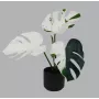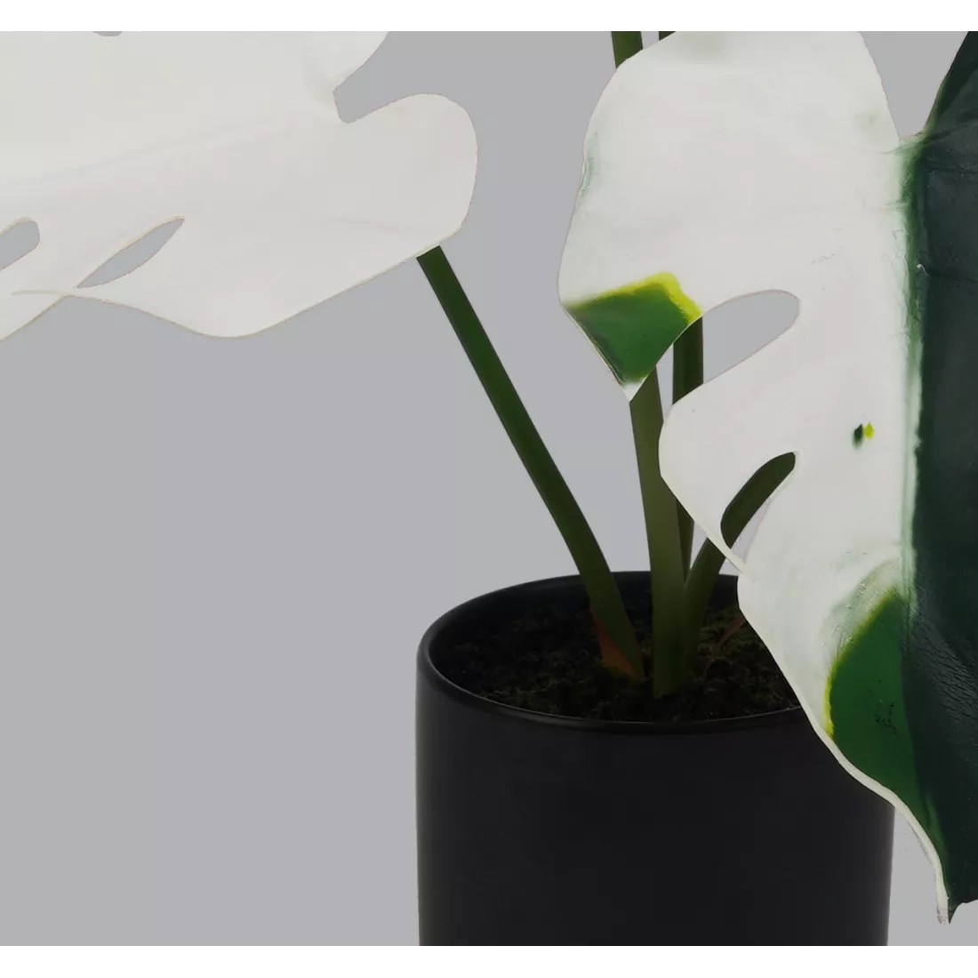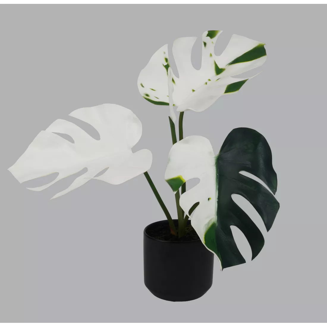 Petit Philodendron Monstera Deliciosa albinos artificiel mesurant 42 cm de hauteur pour une envergure 55 cm variable suivant le déploiement opéré pour son feuillage. Matière polymère thermoplastique. Fausse plante verte livrée dans un pot en céramique noire. La taille indiquée est comprise de la base du pot jusqu'au sommet de la plante.  Composée de 3 feuilles et un bouton. Dimensions des feuilles de 25 cm de longueur pour 18.5 cm de largeur