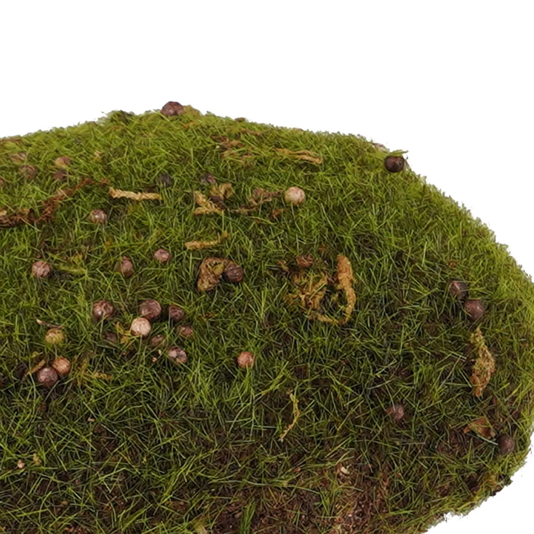 La boule de mousse décorative est fabriquée à base de ouate synthétique. Cette matière la rend souple à l'opposé d'autres galets de mousse durs. Cela permet de la coudre ou de la transpercer facilement avec un fil de fer si c'est nécessaire pour façonner un montage. Elle possède une face végétale verte, et un coté terre. Sur la partie moussue, quelques mini billes et fibres sont dispersées pour imiter les petits déchets organiques qui auraient pu se déposer sur la mousse naturelle comme les graines, des bouts d'herbe ou de feuille. Aussi réussie recto que verso, cette mousse s'expose des deux cotés. Suspendue, présentée à travers une paroi transparente, posée, accrochée, l'esthétique est garantie.