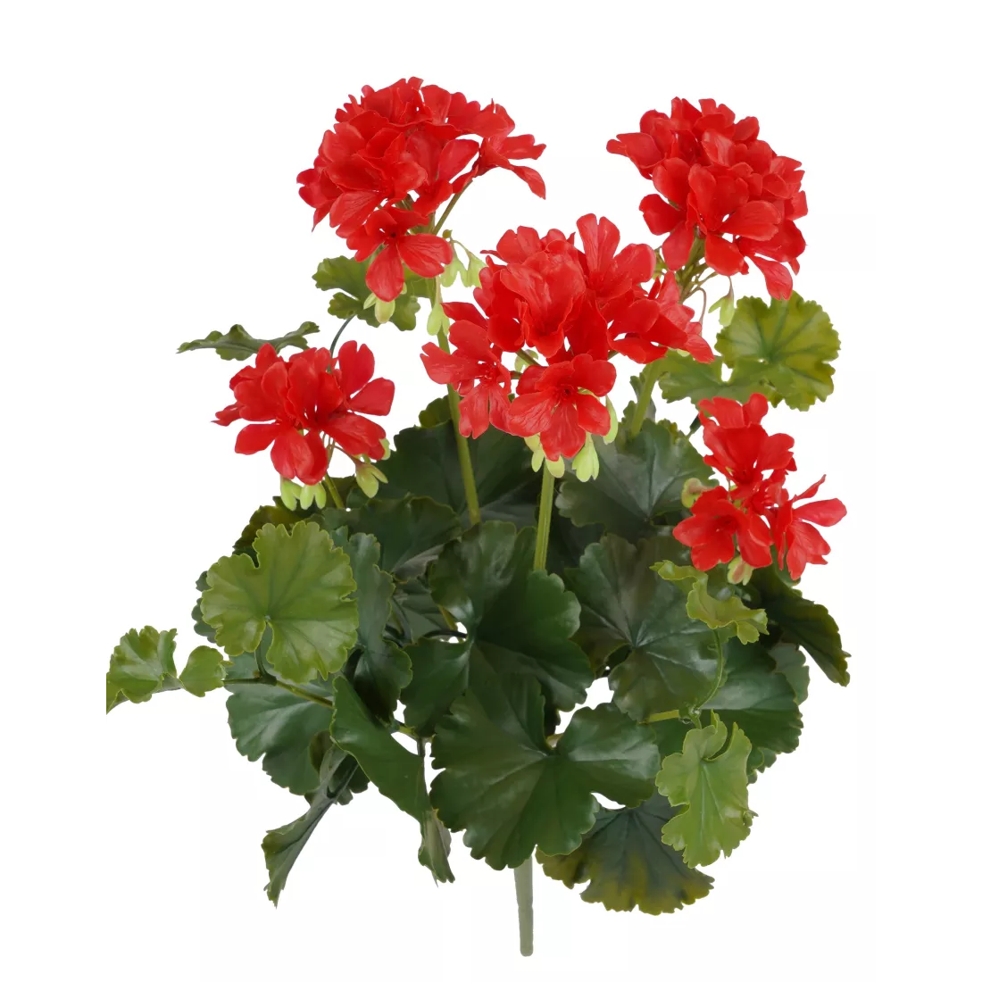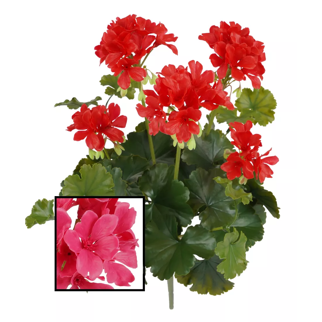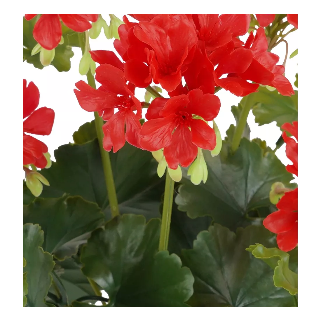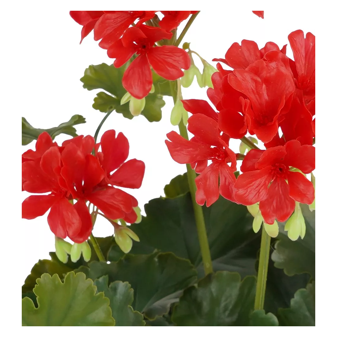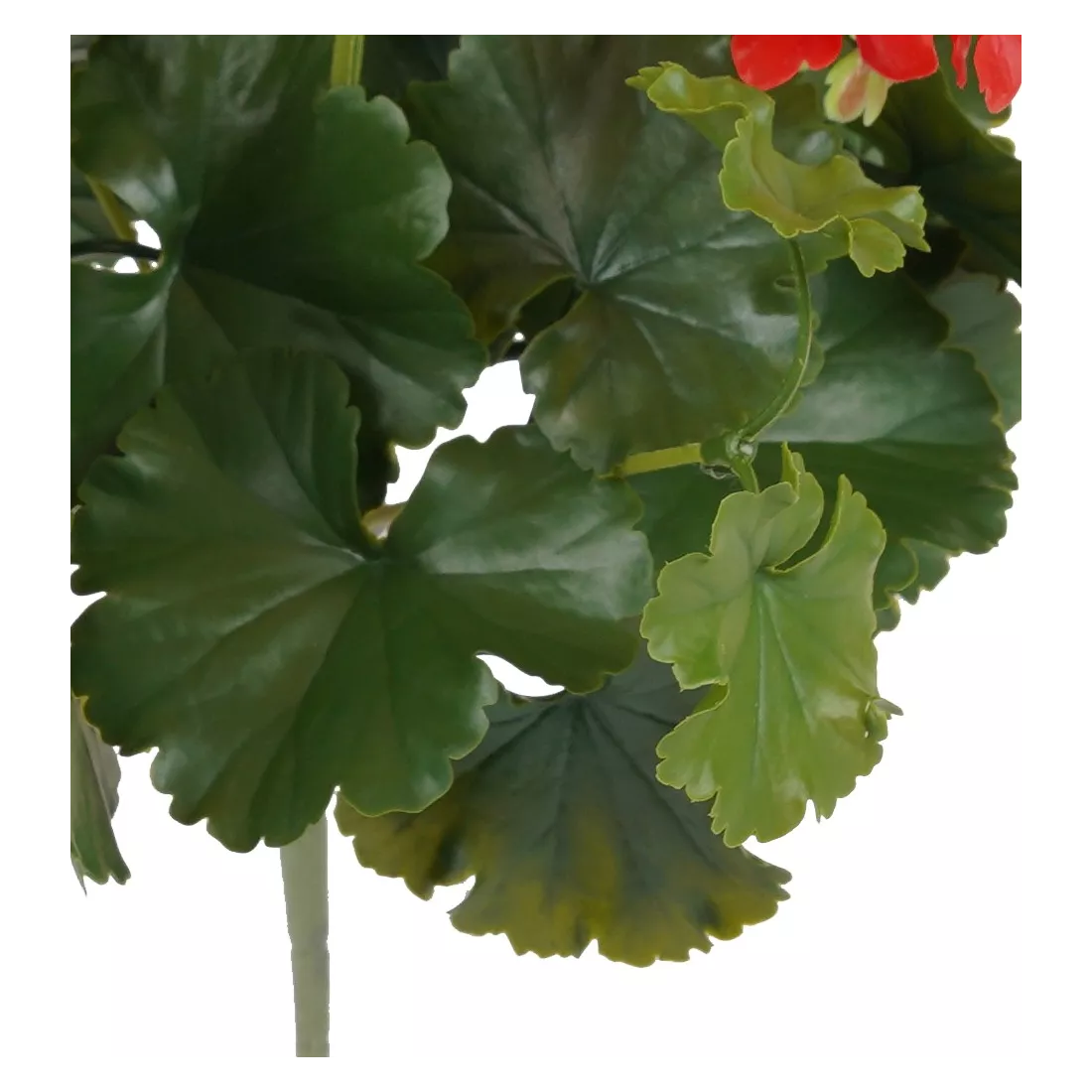 Géranium artificiel qui mesure 65 cm de longueur et d’environ 40 cm de largeur. Un feuillage et des fleurs en plastique, constitués d'environ 110 feuilles artificielles et de 10 têtes de fleurs, en polyuréthane (plastique) . Cette fausse chute de géranium est munie d’un piquet (carotte) d’environ 8 cm en métal recouvert de plastique (plante fleurie vendue sans pot).