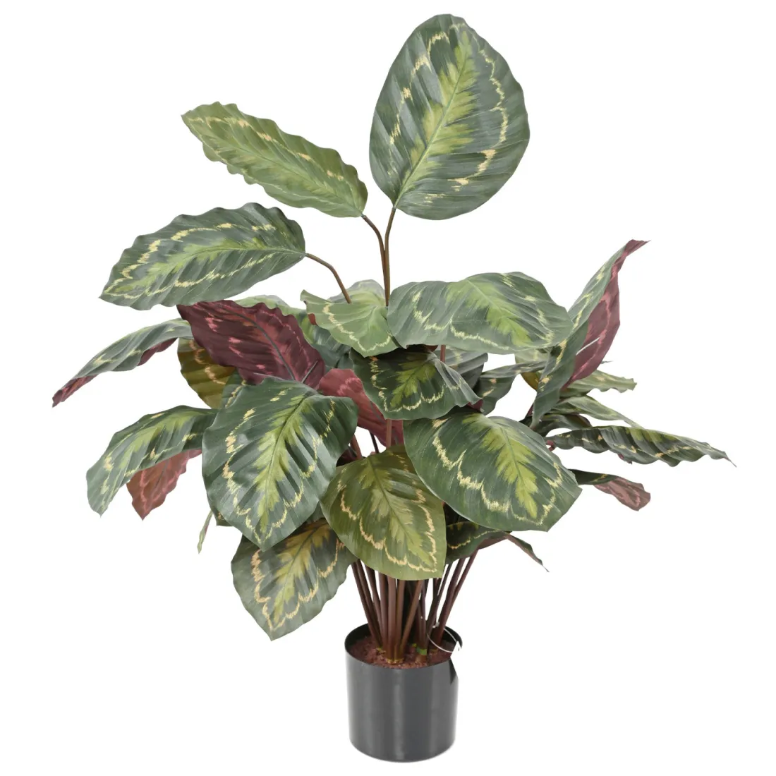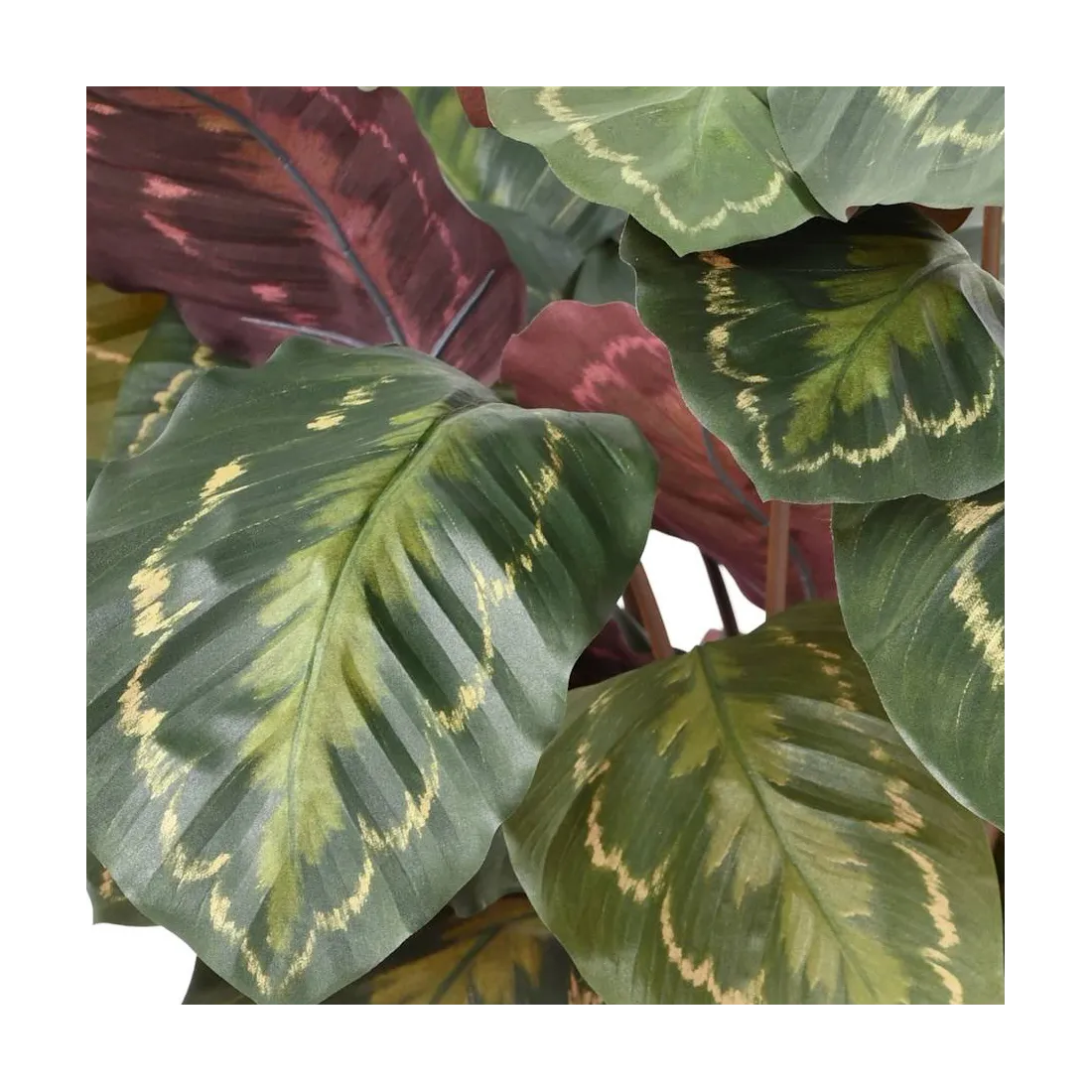 La plante verte d’intérieur Calathea roséopicta est un végétal originaire d'Amérique du sud qui appartient à la famille des Marantaceae. En version artificielle c'est un choix judicieux pour ceux qui souhaitent ajouter une touche de verdure à leur intérieur sans les contraintes liées à l'entretien des plantes naturelles. Avec ses grandes feuilles panachées aux nuances élégantes de vert, de crème et de rouge foncé, cette fausse plante imite à la perfection l’aspect d’une plante réelle.
