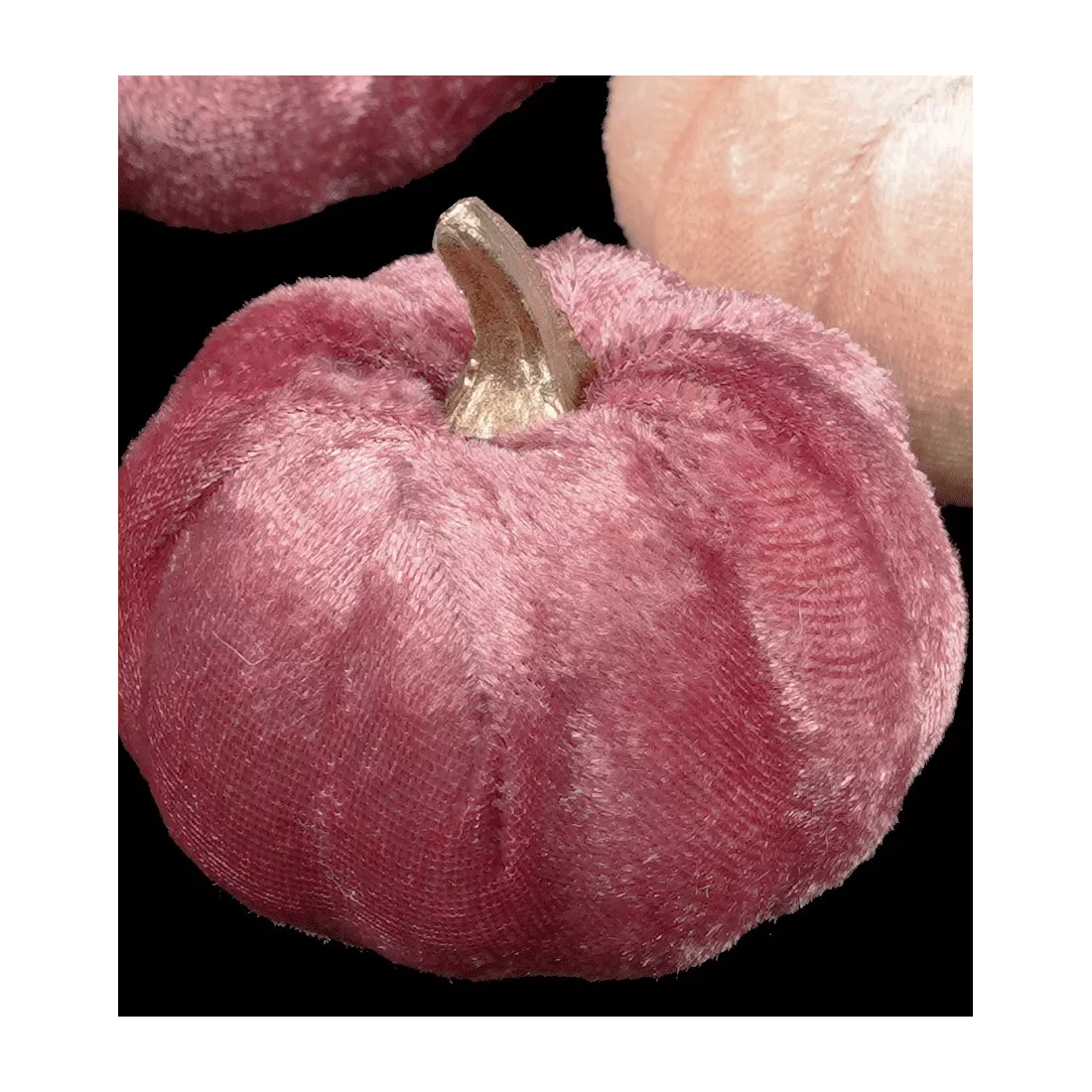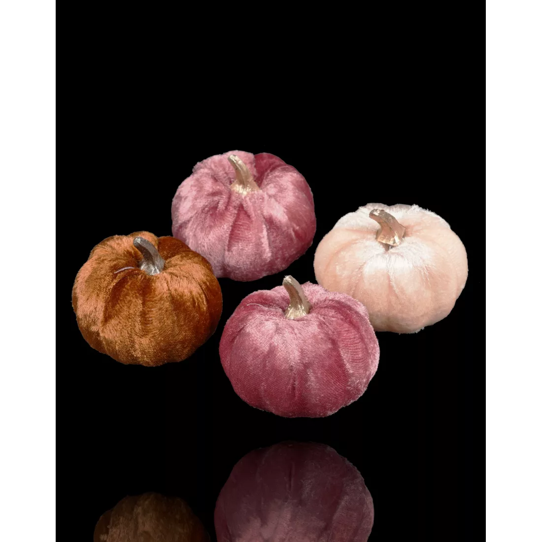 lot de 4 comprenant des citrouilles décoratives en velours. Chaque citrouille mesure 7 cm de hauteur, dont 2 cm pour le pédoncule, et a une largeur de 7,5 cm. Fabriquées en polyuréthane.