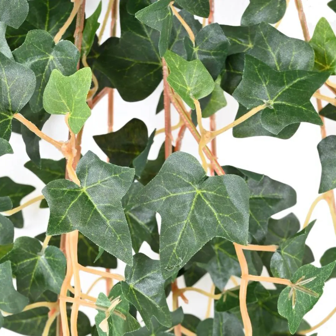 Ce faux lierre tombant possède des feuilles de taille moyenne qui ont été méticuleusement conçues avec des détails tels que les nervures. Les tiges sont de teinte marron clair. Le feuillage en tissu est décliné en 2 tons de vert peu brillants. Chaque liane est modulable grâce à sa structure en fil de fer. Nous vous conseillons de tortiller plus ou moins chaque retombée afin de donner du volume à ce joli lierre factice. Vous obtiendrez alors une fausse plante verte beaucoup plus proche de l'aspect naturel.