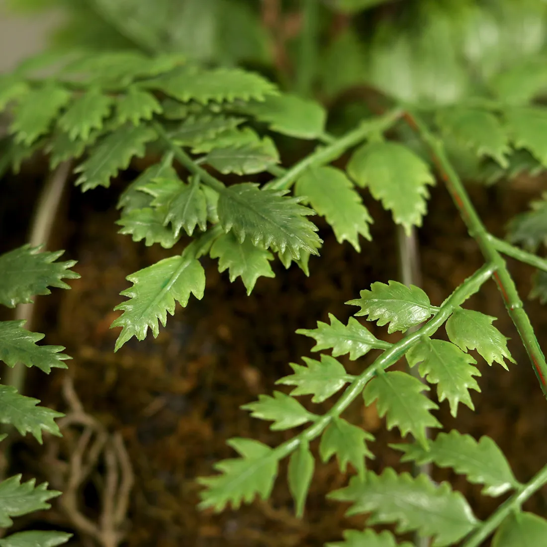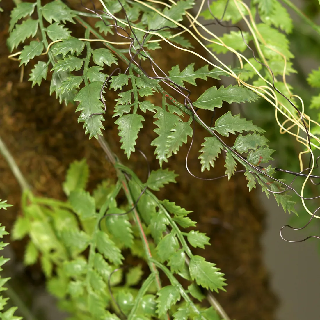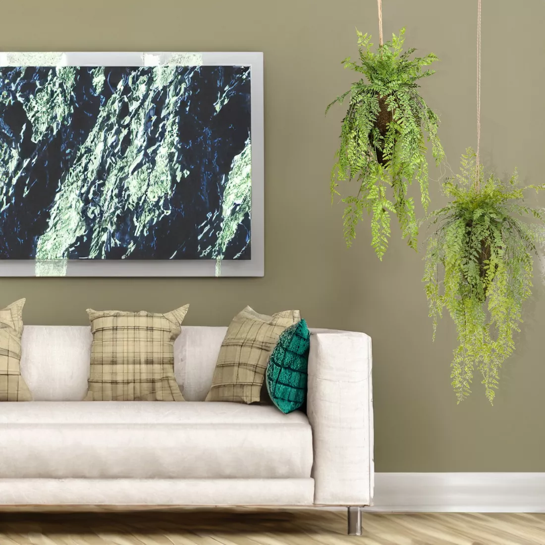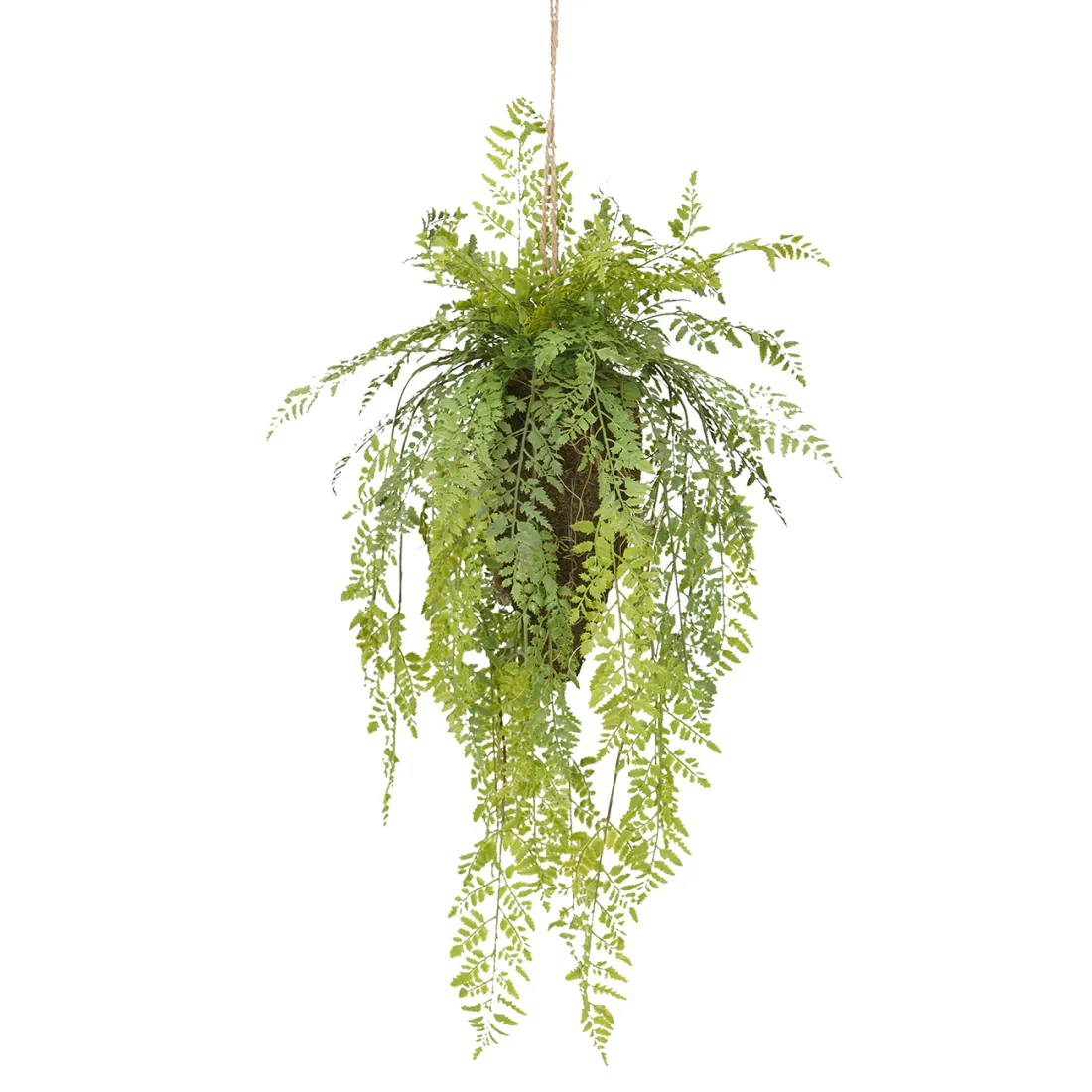 Il vous est difficile de garder de vrais végétaux, les belles plantes artificielles restent un atout durable. Aucun arrosage, zéro entretien et peu importe l'exposition. Avec cette jolie composition de fausse fougère, vous pouvez agrémenter une maison mais aussi une entreprise ou un restaurant. Grande tendance, dans un esprit mur végétal, mélangez des luminaires suspendus avec des suspensions de plantes. Par sécurité, les ampoules et les faux végétaux ne doivent pas se toucher, surtout si les ampoules chauffent.