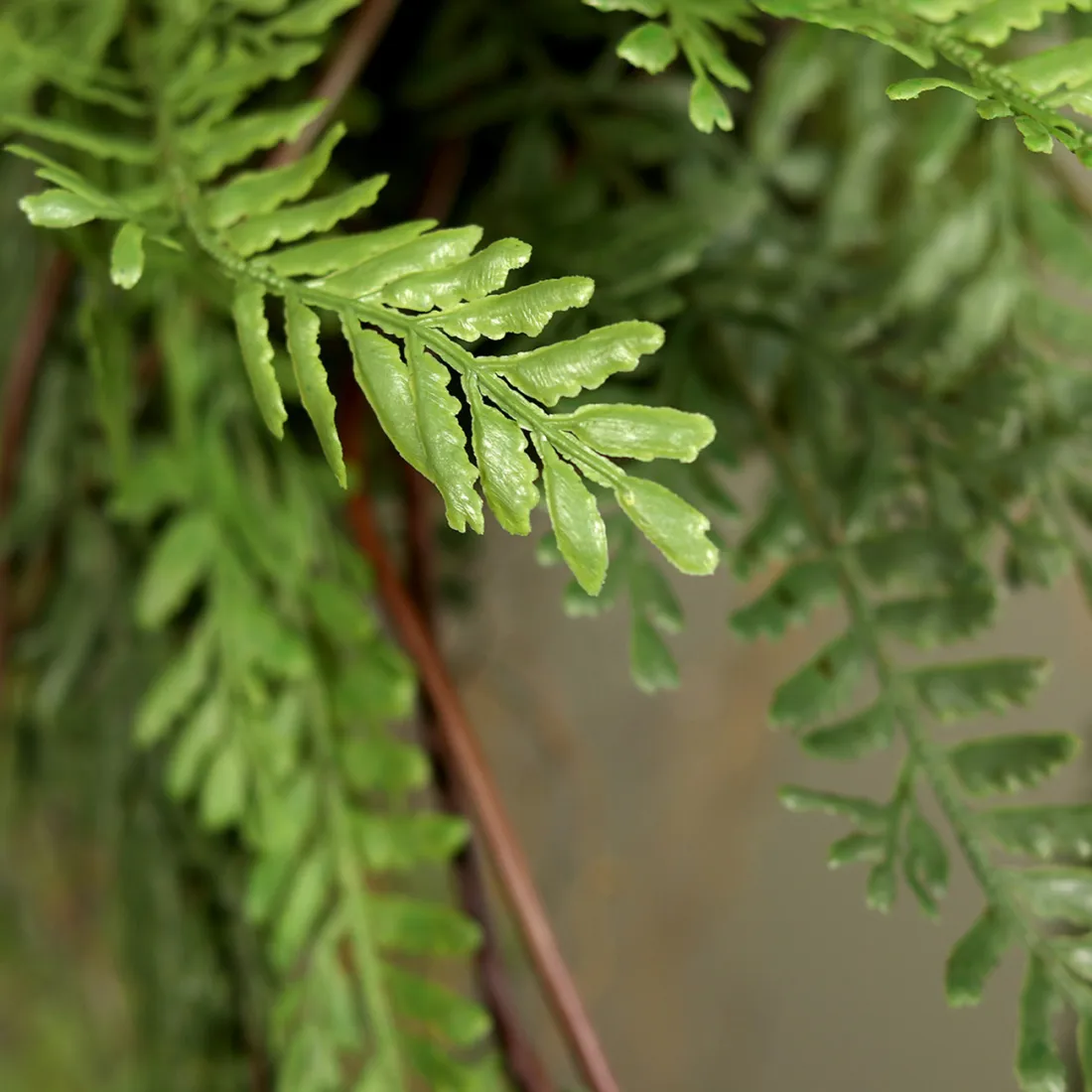 Cette fausse plante verte suspendue répond aux tendances décoratives végétales. Un petit coin de nature qui perdure sans entretien, c'est l'atout de cette jolie fougère artificielle piquée sur une imitation de bûche en partie recouverte de terre et de mousse synthétiques. La composition est légère car le faux morceau de bois est formé avec du polystyrène; la fougère artificielle pèse peu. L'arrangement végétalisé s'associe parfaitement avec d'autres suspensions verdoyantes, plus petite ou plus imposante.