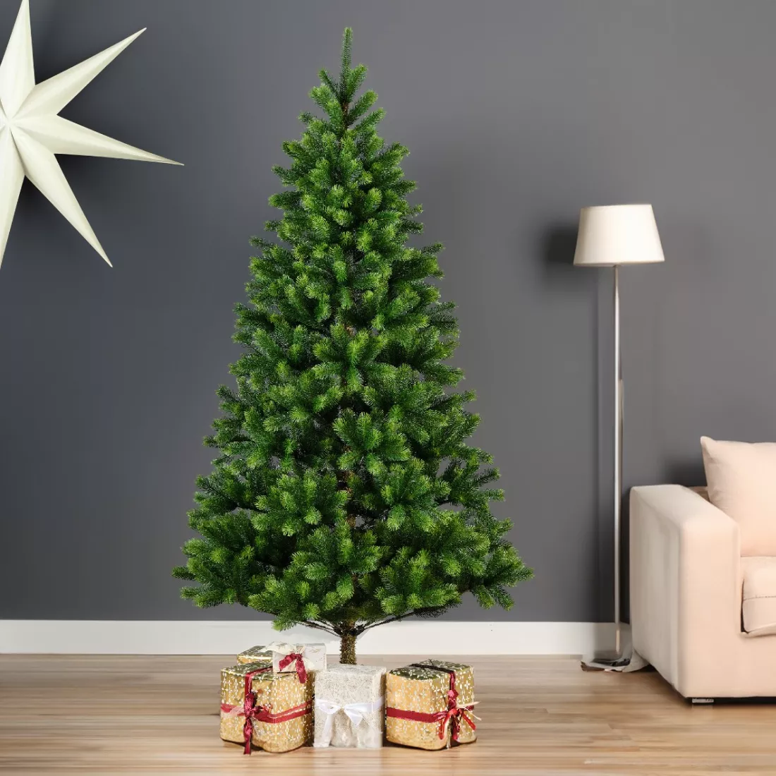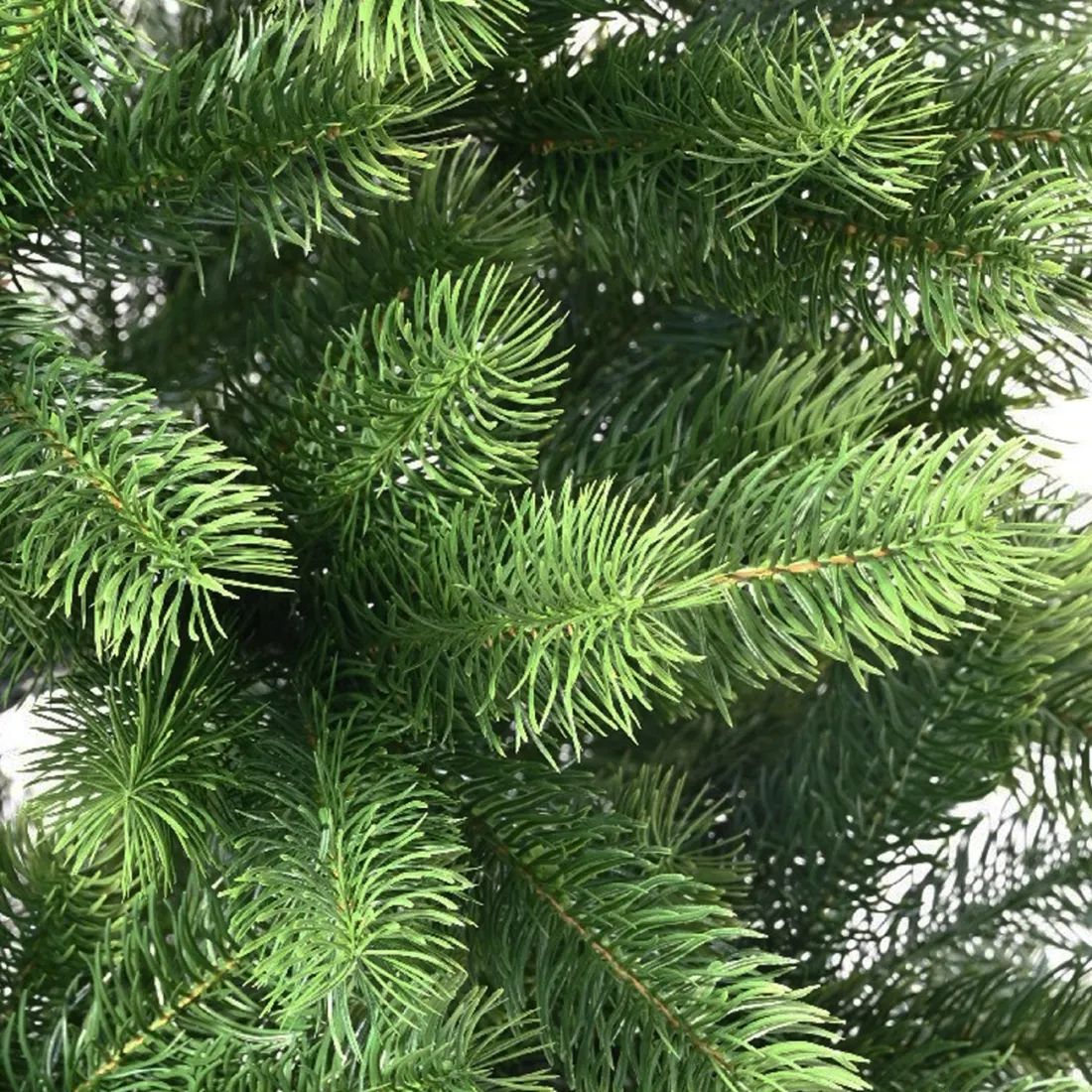 Nous avons eu un coup de cœur pour ce faux sapin réaliste. Vous allez sans doute craquer vous aussi pour notre arbre de Noël au port majestueux qui propose un prix raisonnable pour un sapin haut de gamme. Les aiguilles sont rigides mais non piquantes. Elles ont la particularité d'être déclinées en 2 nuances de vert  mélangés (vert tendre et vert plus foncé); cela est peu courant parmi les sapins synthétiques. Les jonctions du tronc sont invisibles, il est volontairement recouvert avec une guirlande d'épines plates de coloris vert panaché marron. C'est la représentation d'un arbre de la forêt jonché de mousse.