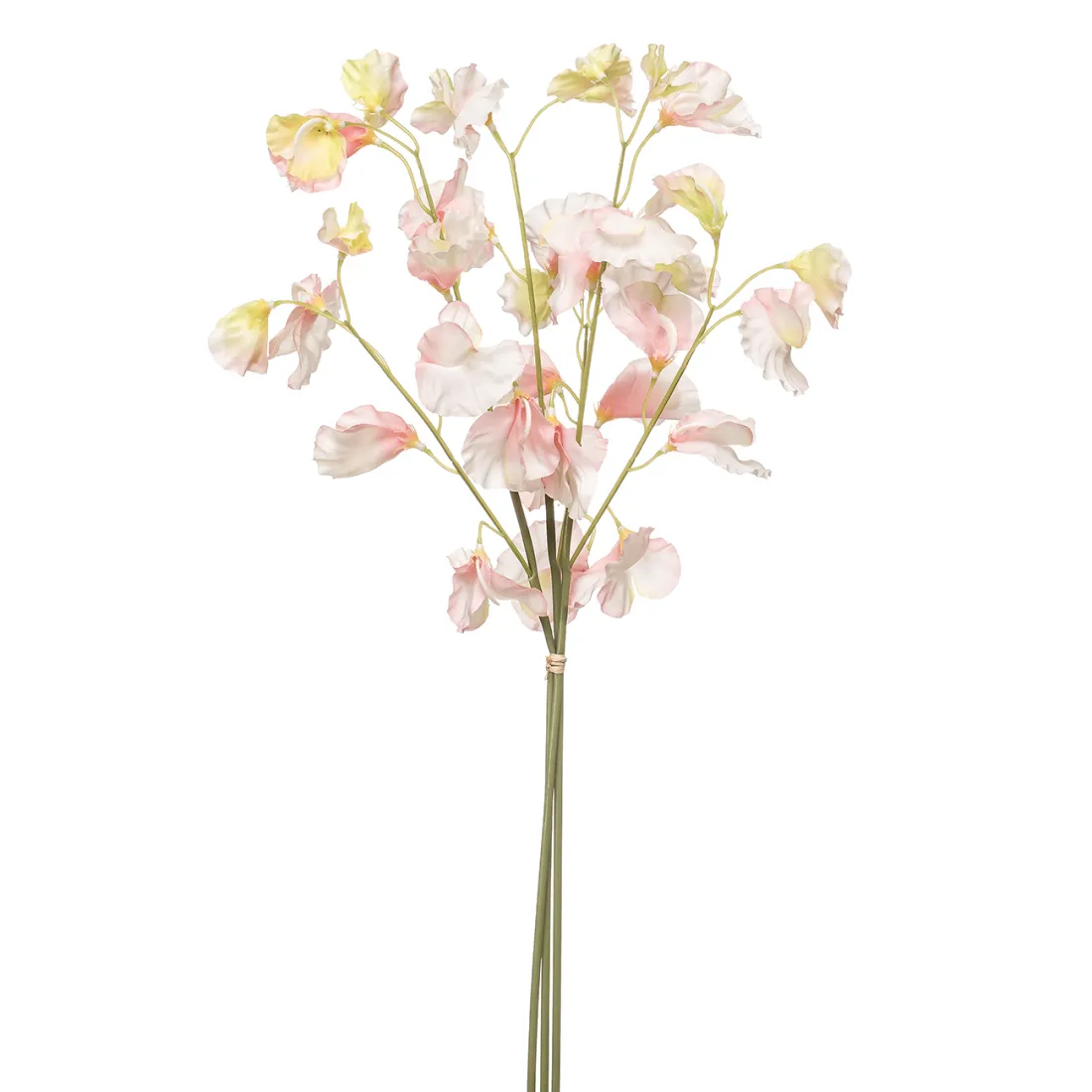 Le Lathyrus est une fleur bien connue dans les jardins fleuris. Comme la plante naturelle, nos pois de senteur artificiels sont composés de grappes de fleurons en forme de papillon. La légèreté et la délicatesse des fleurs sont combinées à la fraicheur des coloris pastel, rose et pêche. Vous aurez plaisir à glisser les 3 tiges raffinées dans un petit vase pour agrémenter un coin de la maison. Le coté aérien des fleurs vous permet également de les mélanger pour réaliser des arrangements aux couleurs printanières ou estivales. Des compositions de roses ou de pivoines par exemple, mais aussi de mignons petits bouquets de pois de senteur aux teintes mélangées. La tige est très souple, le pois de senteur peut parfaitement se tordre pour élaborer de jolis ronds de serviette pour un déjeuner ou un diner d'été.