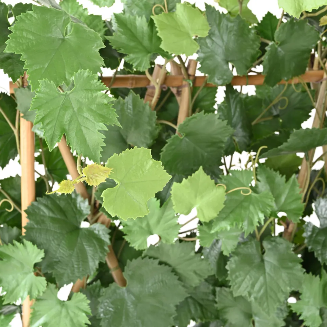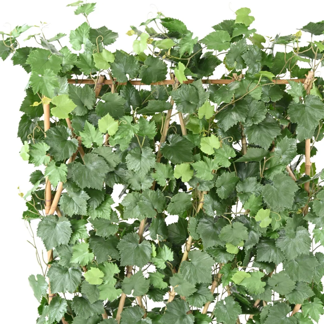 Haie artificielle de vigne formée de cannes de bambou naturel et d'un feuillage vert en polyéthylène.